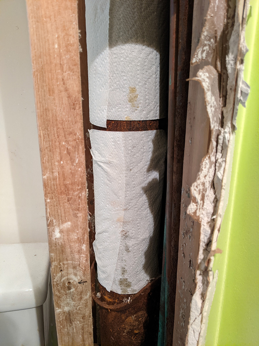 yesterday i'd wrapped paper towels around the exposed sewage pipe to see if it was leaking. this morning there was a small wet spot. just to be sure, i wrapped another ring of paper towels a bit lower on the pipe.
