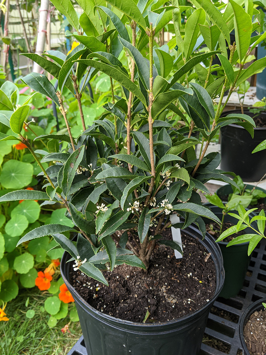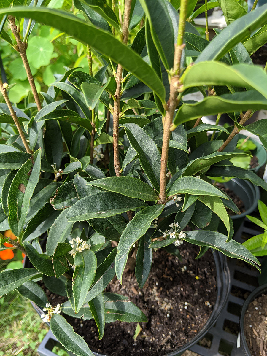 i finally got to see the new osmanthus fragrans from home depot. actually, i'm not exactly sure if it is an "osmanthus fragrans" because it's simply advertised as tea olive, but i'm assuming it's osmanthus fragrans. anyway,