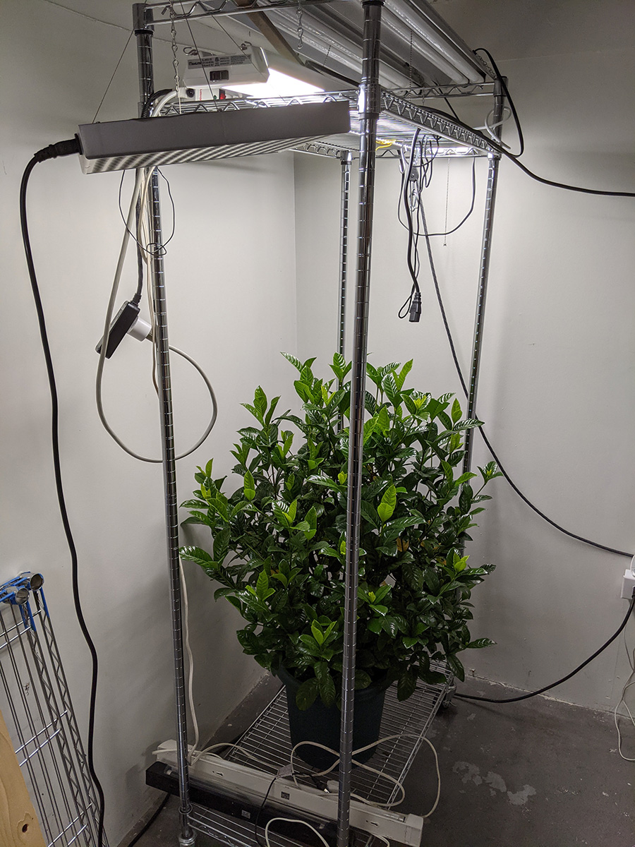 the gardenia has been yellowing, it doesn't like it when the temperature dips below 60 degrees, which compelled us to re-open the grow room for the winter season. we decided for this year to keep some smaller plants on the adjustable wall using either my strip grow lights or a large 100W LED grow light suspended from the ceiling. we decided not to bring the plant stand into the basement grow room because it'd take up too much space.