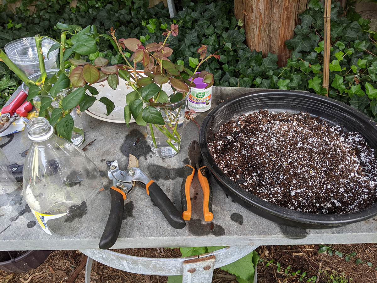 my father and i cut the long rose stem he collected from the cafe parking lot into cuttings and planted them in makeshift containers made from either a 2 liter soda bottle or boba ice tea containers. fall rose cuttings can be a challenge because the roses go dormant during the winter. it won't be until spring before we'll see any growth action. we've never propagated rose before so this is a first. we shaved off a bit from the end before dipping it in root hormone and then plant it in a 3/4 potting soil 1/4 perlite mix.