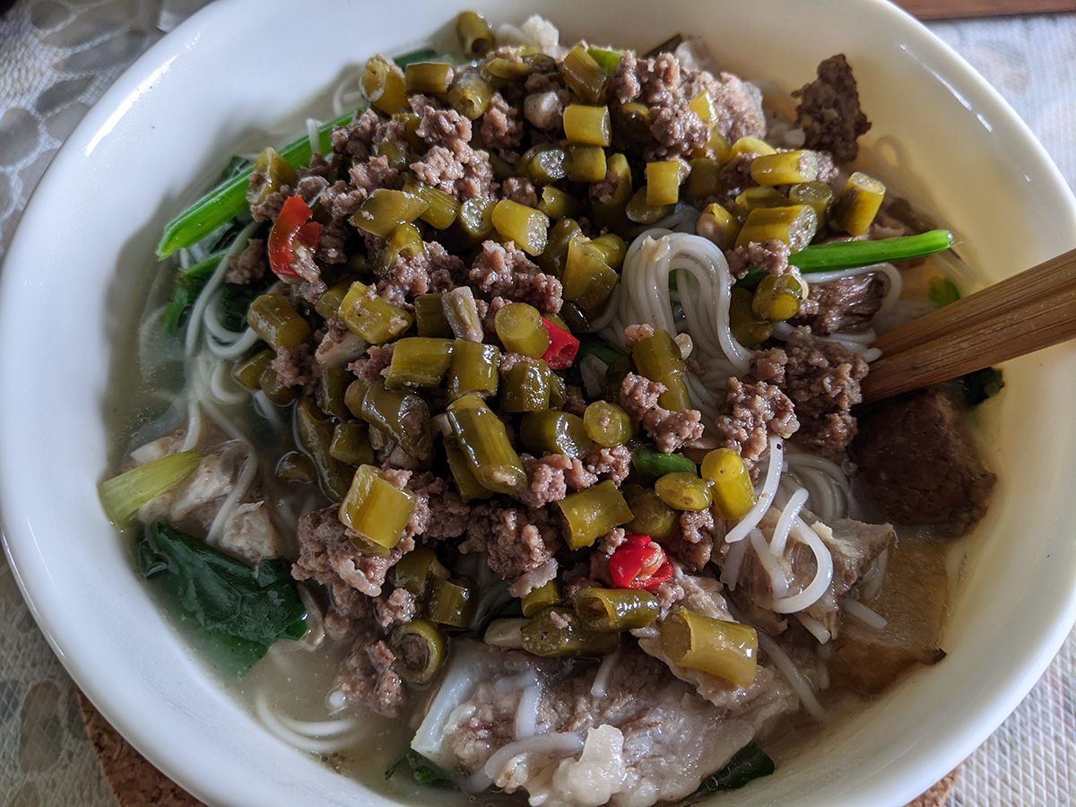 my mother made thin noodles for lunch, mixed with some leftover minced beef with fermented long beans.