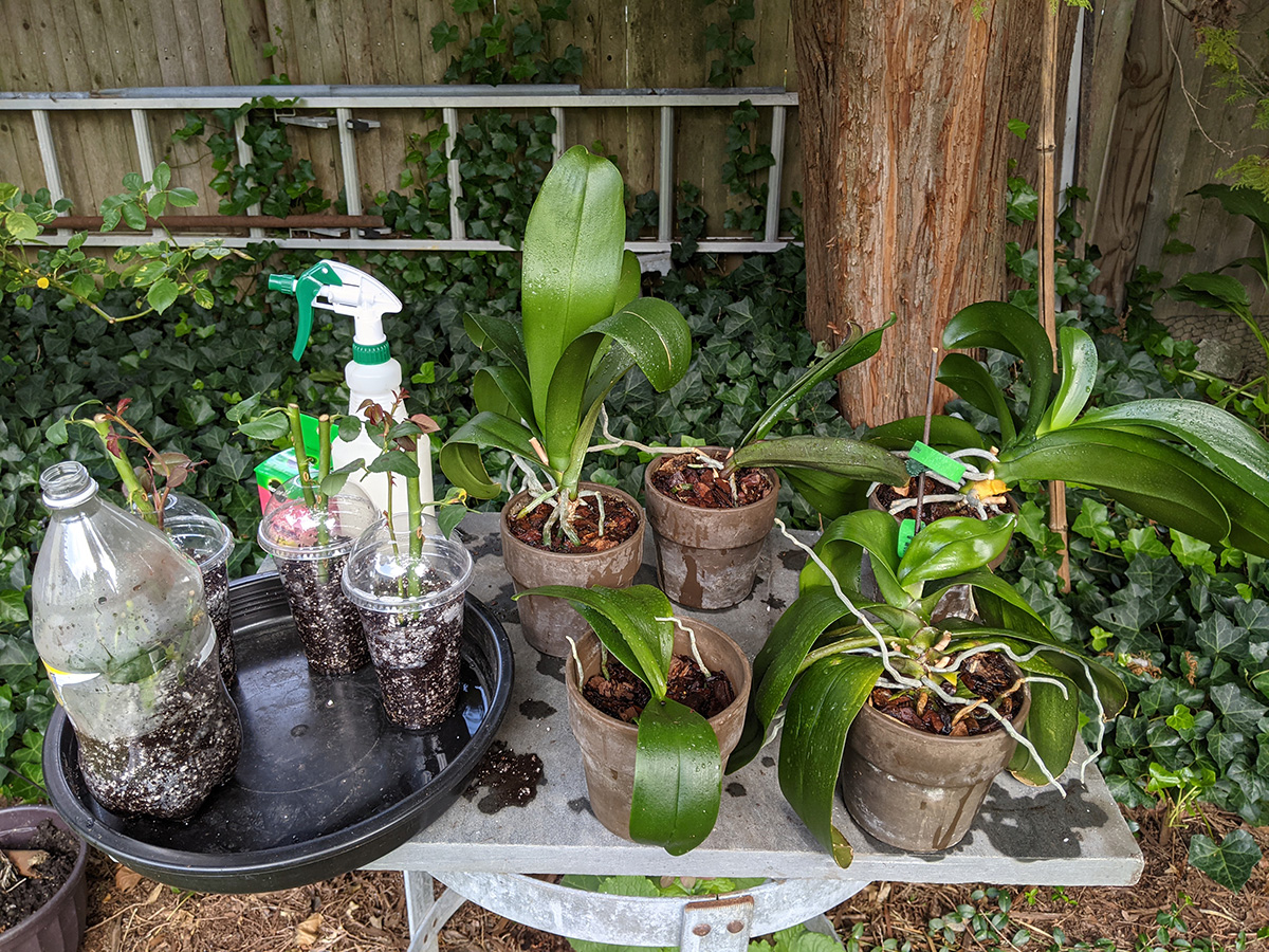 i also brought out the 5 orchids and gave them the full treatment: spray neem oil extract on the leaves to get rid of mealybugs then soak the grow medium in orchid fertilizer solution before pouring the back into the bucket. i poured the leftover acidic fertilizer into the gardenia pot. i think i might try making a solution of imidacloprid (systemic pesticide) and giving the orchids a thorough drench.