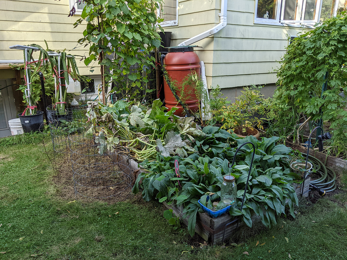i also relocated any errant foxglove plants i came across. sometimes they'd be growing on the lawn along the borders, or growing in the raised beds. i moved them all underneath the grapevines. i took the cages off of my lotus barrels. alas, this will be my last year growing them. after 3 years i haven't had any luck getting them to flower, nor can i keep them alive over winter. the past 2 years i've used lotus seeds from china, which are smaller and don't even produce any aerial leaves. if i ever try raising a lotus plant again, i'll just buy a healthy adult rhizome online instead (which i may do for next season, but definitely not growing them from seeds anymore). i saw a blue morning glory flower for the very first time this season. too bad the growing season will soon be over for a flower show.