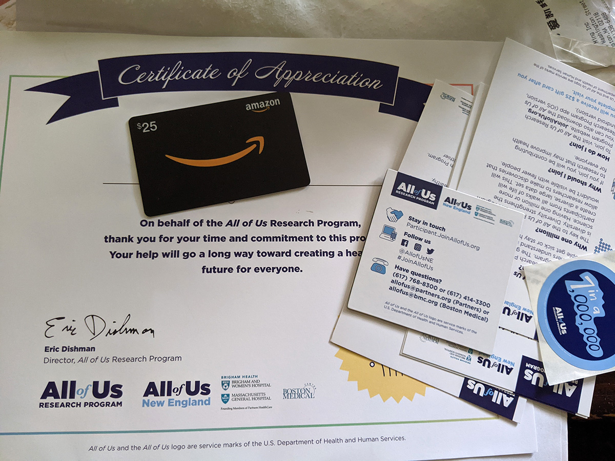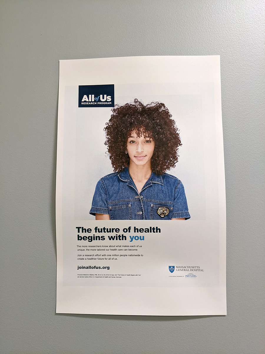 i met jennifer, who came down clutching a macbook computer. before we went upstairs, she had me disinfect my hands then put on a new face mask. i'd already participated in a genetic research project a few months ago when i had my annual physical and someone asked if i wanted to join the MGH biobank program when i was getting my blood drawn. the "all of us" study is similar, but it's federally funded by the NIH.