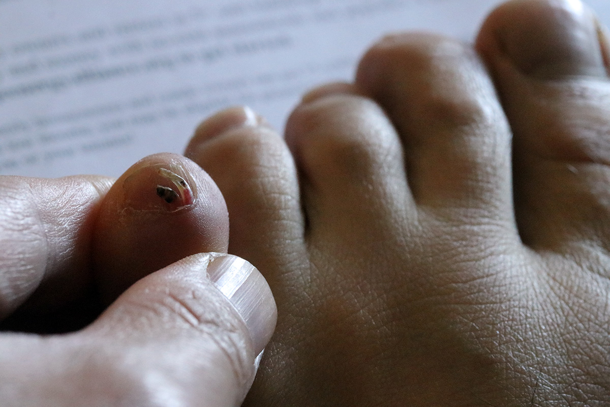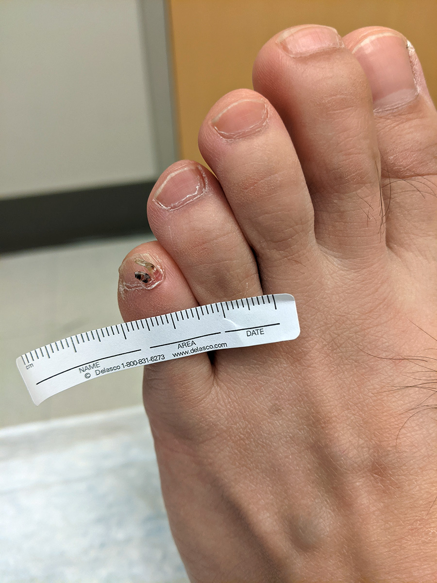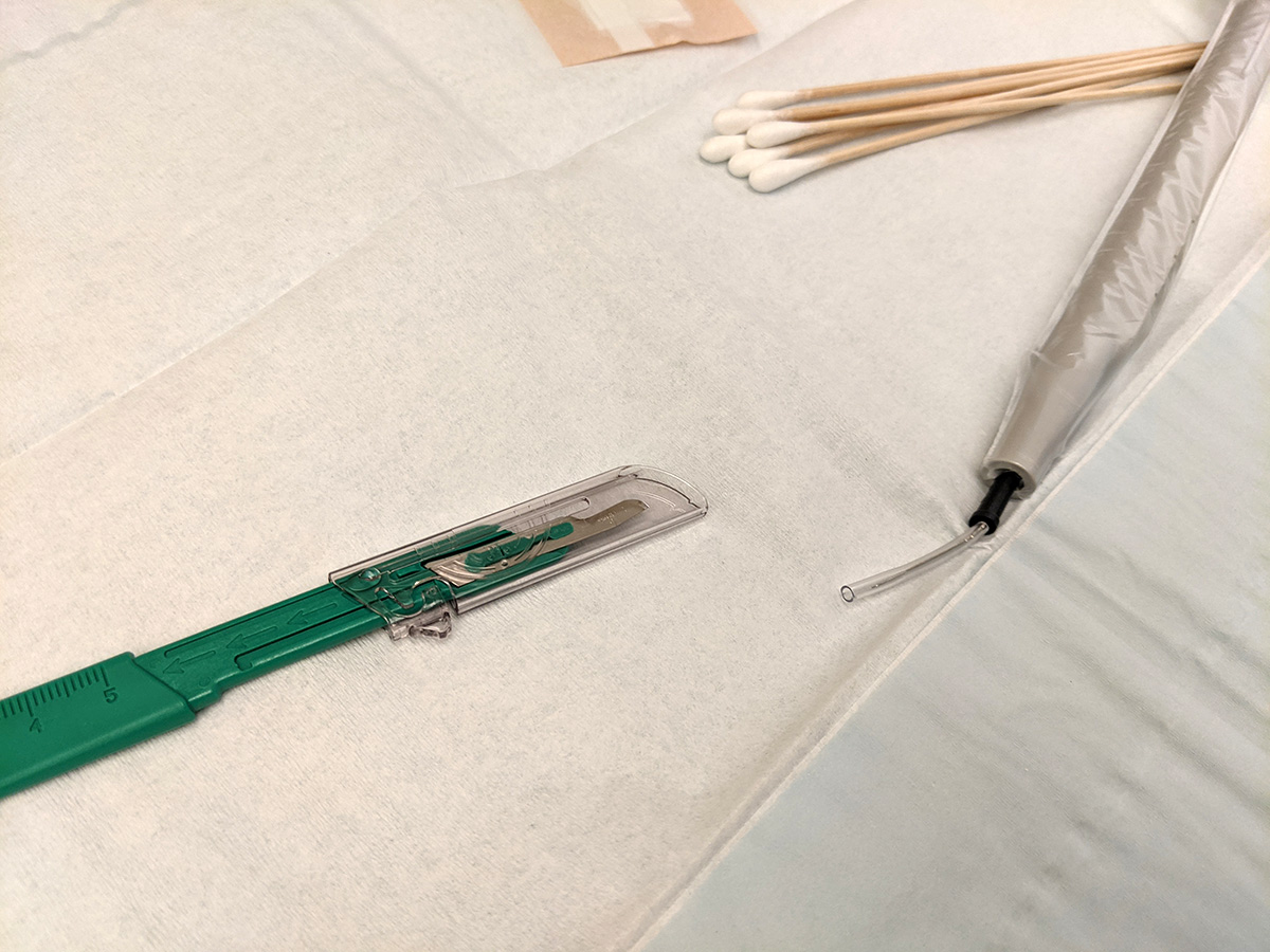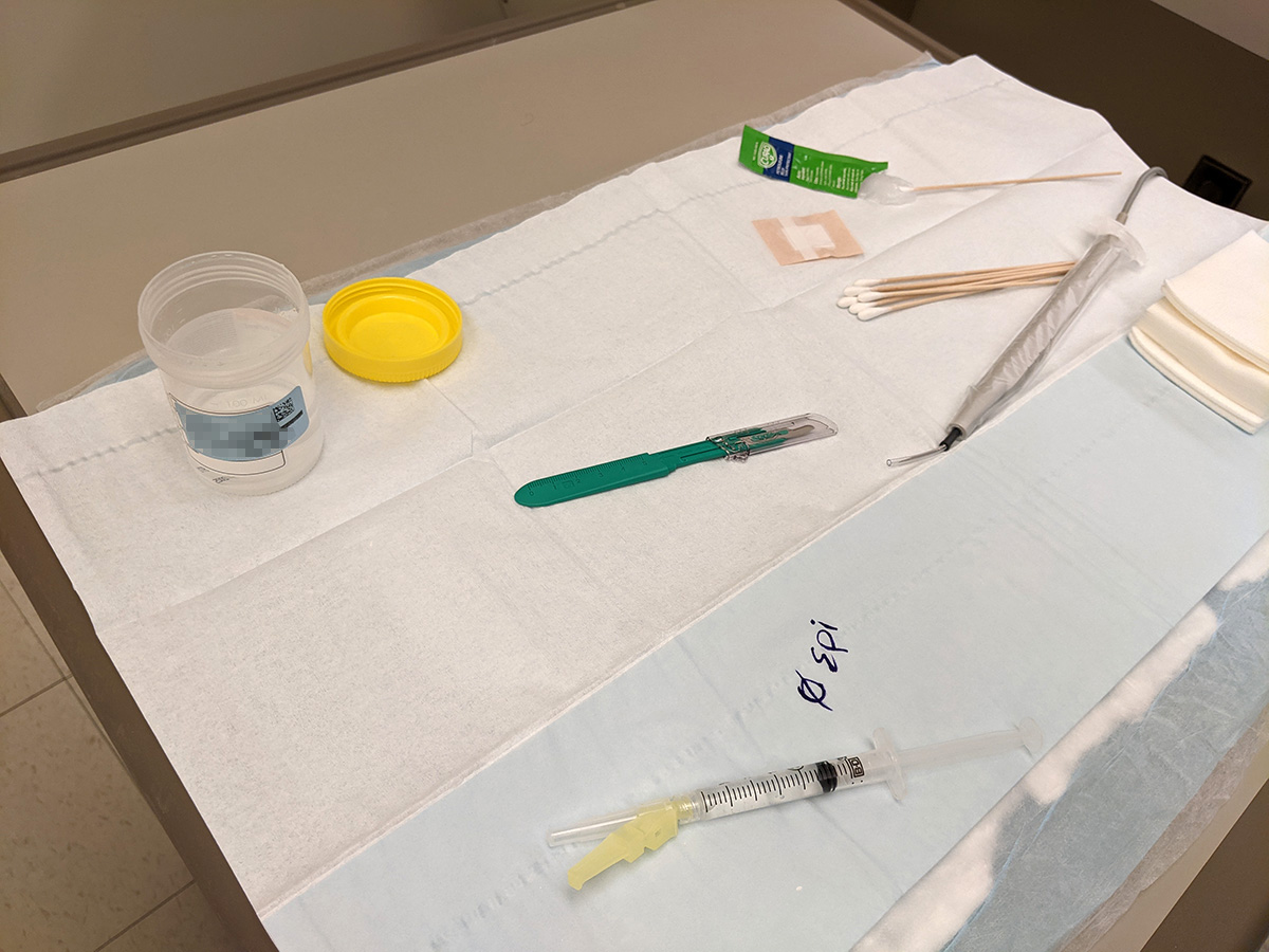 minutes later the nurse came back with the equipment and sample cup. there was a syringe full of lidocaine, a scalpel, bandaid, gauze, vaseline, and something that looked like a cauterizing device. she placed all the equipment on a wheeled table. she then took some photos of the toe with a scale indicator sticker. she warned me that the lidocaine injection would hurt, which got me a little worried. she left the room, told me to sit back on the examining bed and relax.