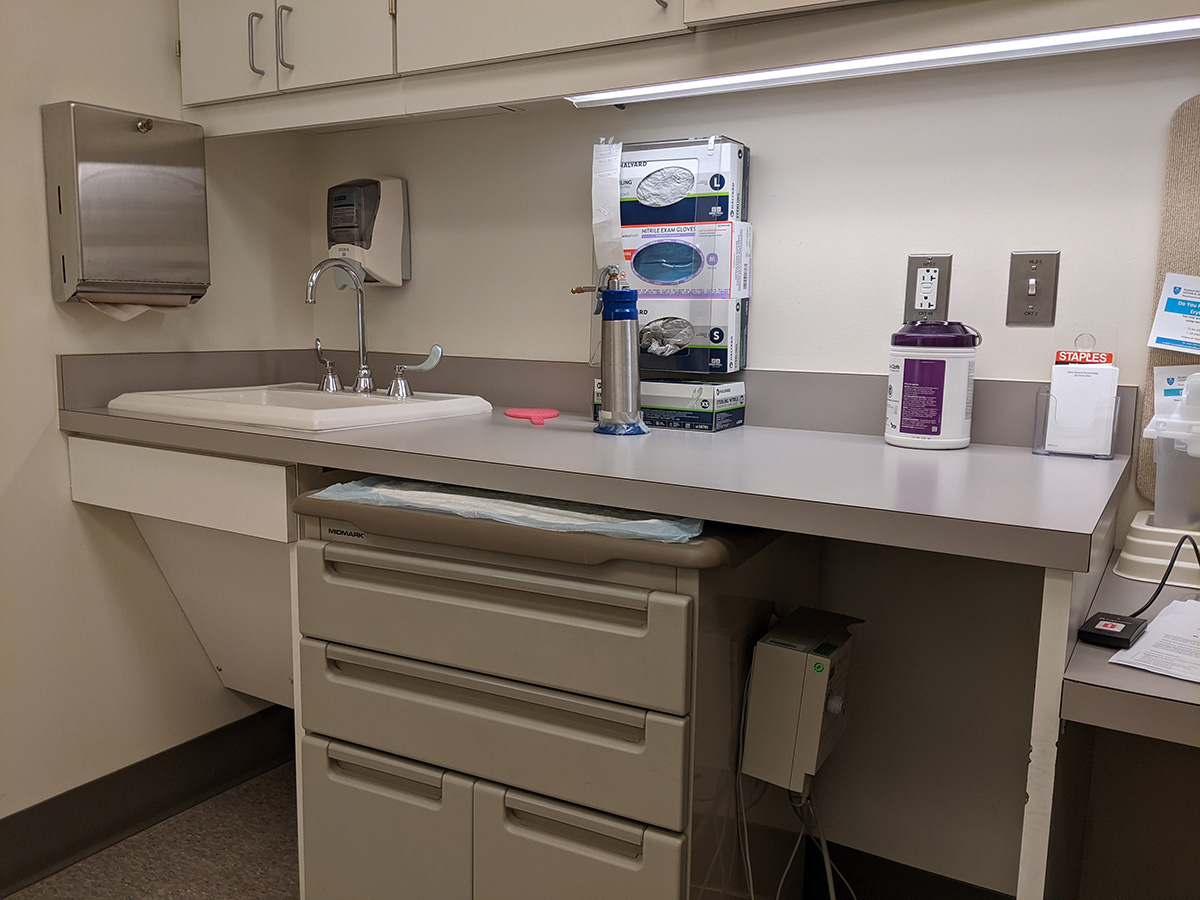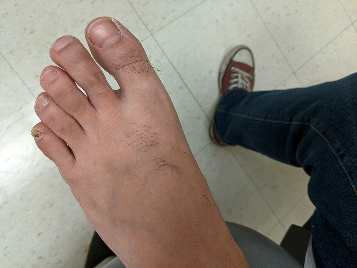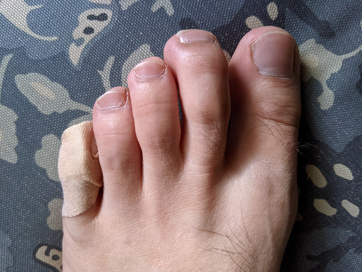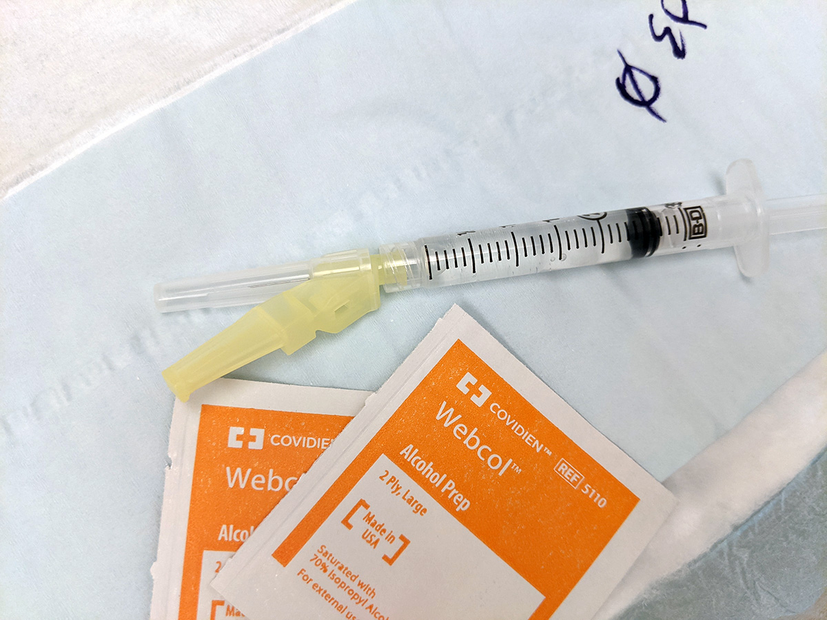 minutes later the nurse came back with the equipment and sample cup. there was a syringe full of lidocaine, a scalpel, bandaid, gauze, vaseline, and something that looked like a cauterizing device. she placed all the equipment on a wheeled table. she then took some photos of the toe with a scale indicator sticker. she warned me that the lidocaine injection would hurt, which got me a little worried. she left the room, told me to sit back on the examining bed and relax.