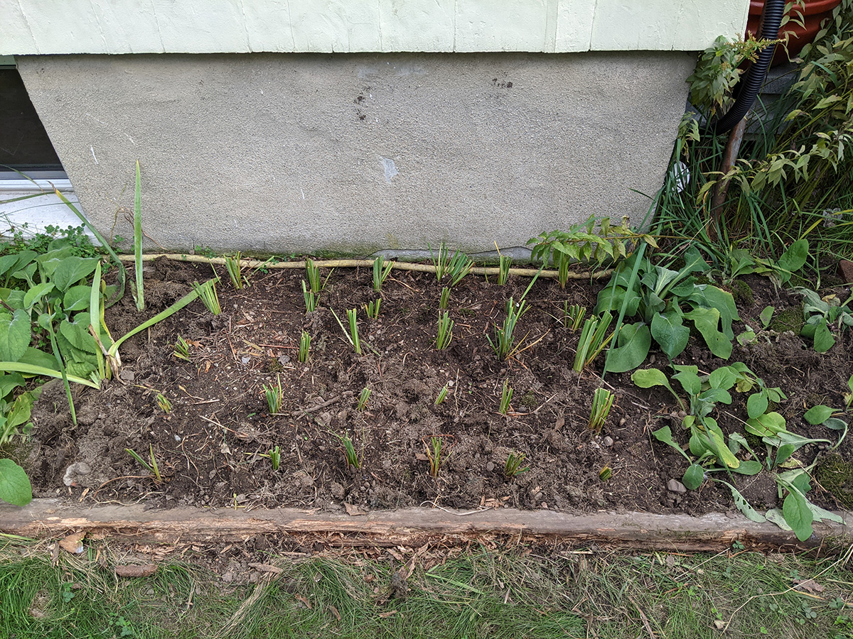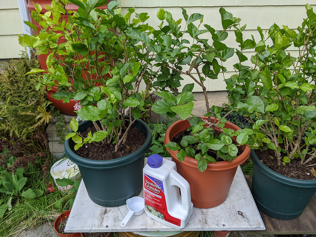before we moved the plants, i added bonide systemic granules (0.22% imidacloprid insecticide) into the soil. the larger 3 gallon pots i added 1/2 cup of granules, while the smaller ones only get a tablespoon or two. my father and i scratched the granules into the soil. i also added some new potting soil to some of the potted plants that needed it.