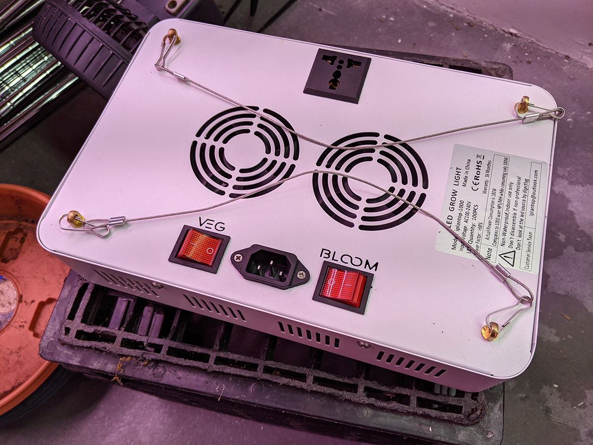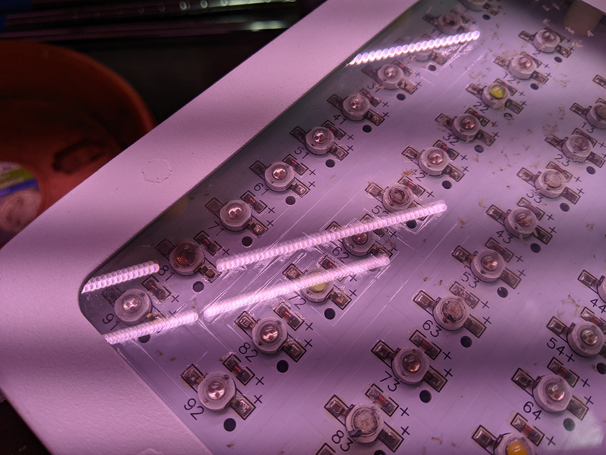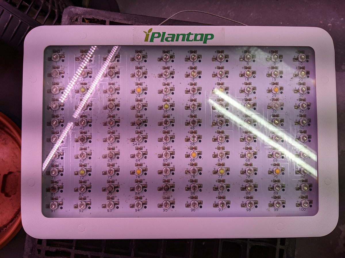 around 3pm we started moving the plants into the grow room. we discovered one of our two iplantop led grow lights is damaged, only half the vegetative lights will turn on. when we examined the led's, we can see one of them has burnt out completely, with a bunch probably on that same string also damaged. this wasn't the first glow light we bought (that honor goes to the XECCON 1000W, september 2019 $55), but these iplantops were good enough that we bought two (september 2019 $69 and october 2019 $73, right during that time amazon started charging state sales tax). fortunately we have another grow light - the LUXAUTO 1000W (january 2020, $57 before a gift card that cut it down to $29).