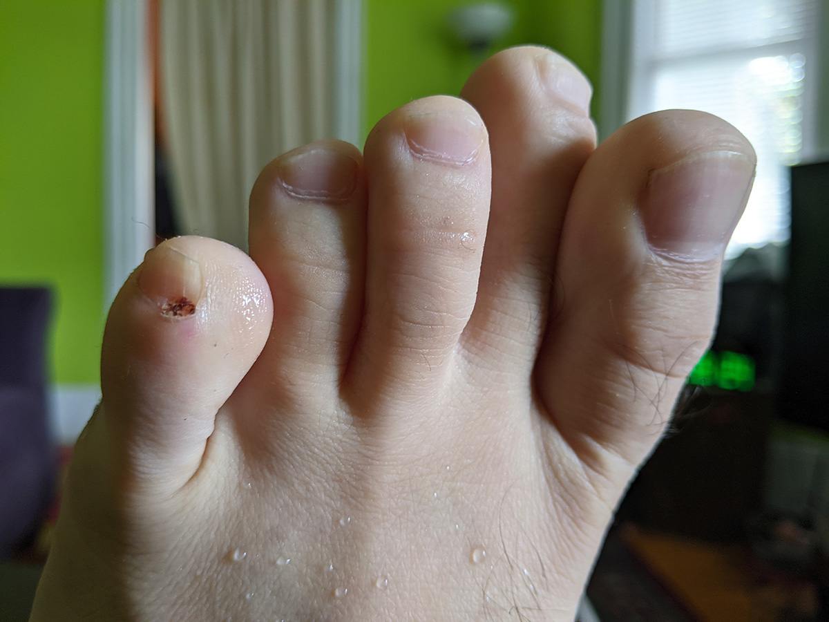 i know the nurse told me to wait 24 hours, but the care sheet she gave me said i could wash the biopsy wound on my toe and change the bandaid. so i was happy to take a normal shower that didn't involve balancing or propping up my leg at an awkward angle. afterwards i checked out my toe, it didn't look that bad, like the kind of wound i might sustain if i injured my toenail. there was also zero pain. i applied some petroleum jelly and put on a fresh bandaid.