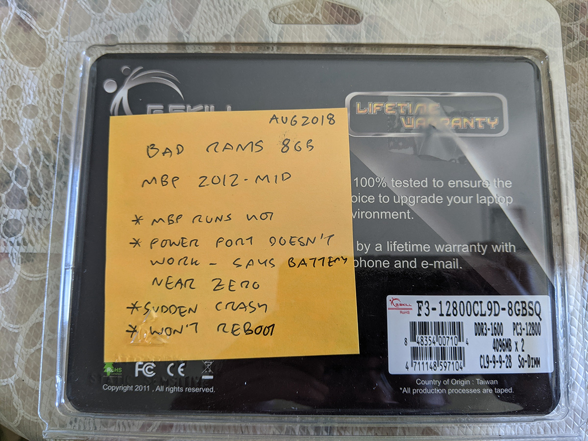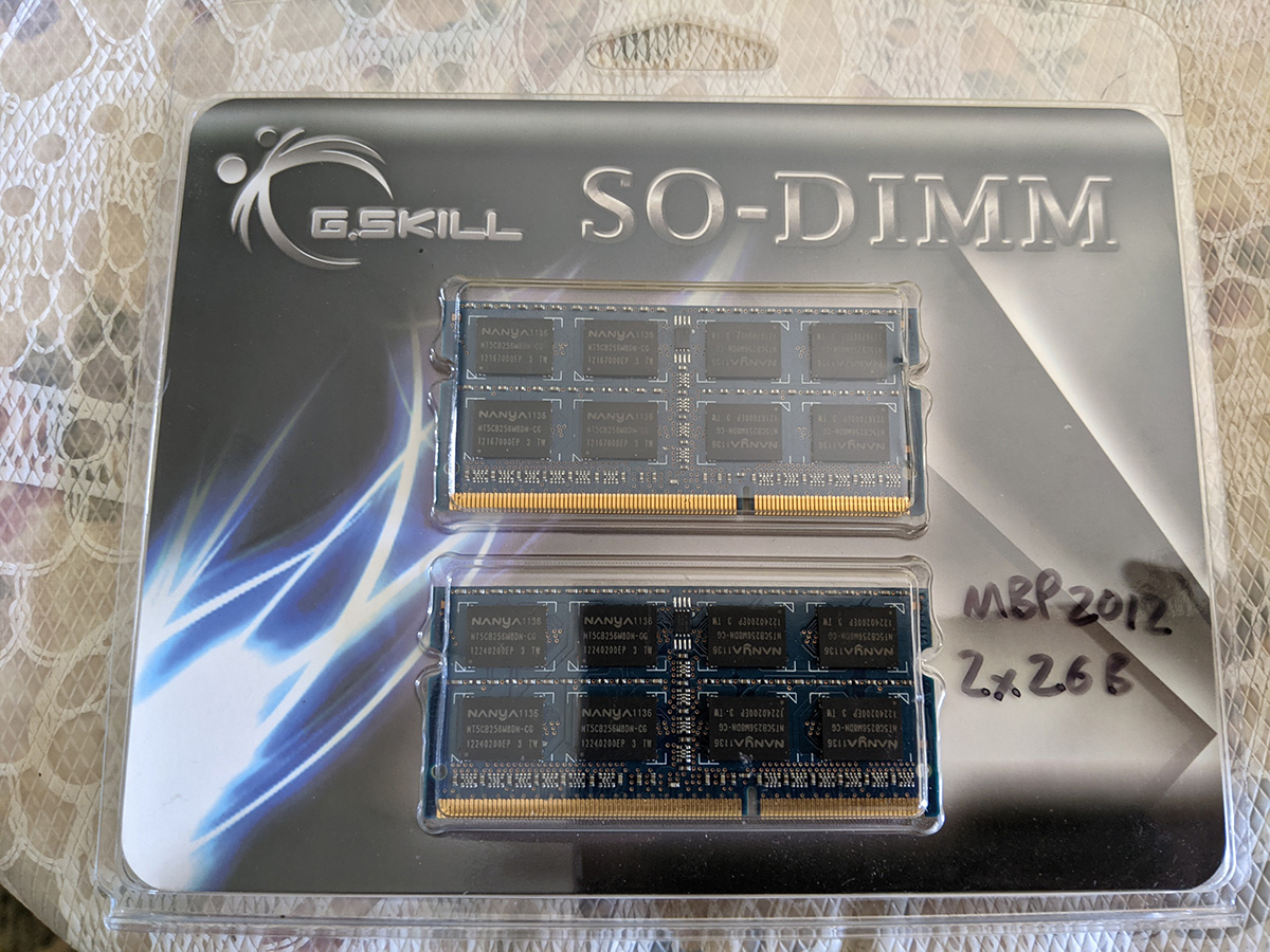 first thing i did when i arrived at my parents' place was replaced the RAM on my father's macbook pro (15" mid-2012). sometimes bad memories can cause a computer to start acting weird like it did last night. the computer originally came with 2x2GB RAM's, but i upgraded them to 2x4GB back in 2013, then once more to 2x8GB. i couldn't find the original 2x2GB memories but i had the 2x4GB.