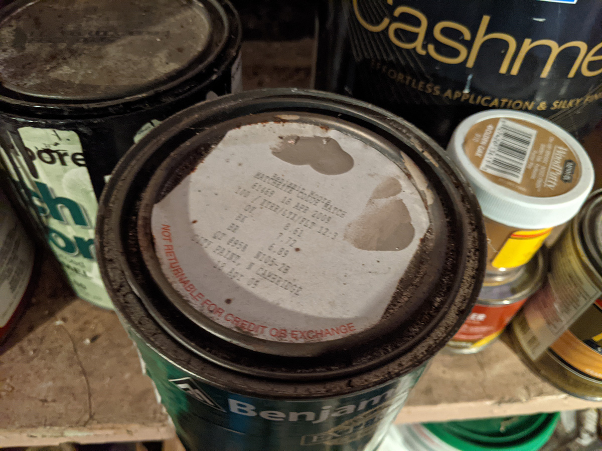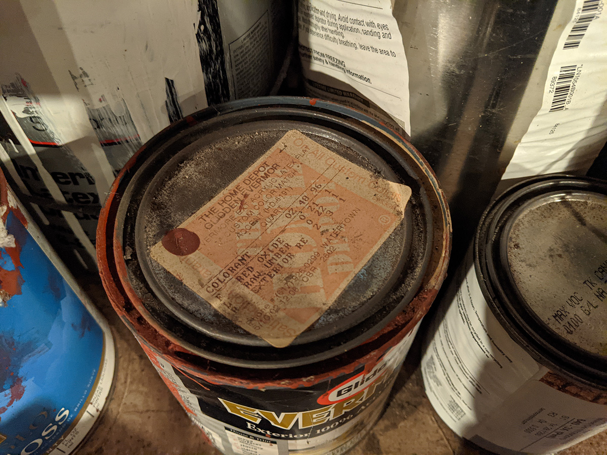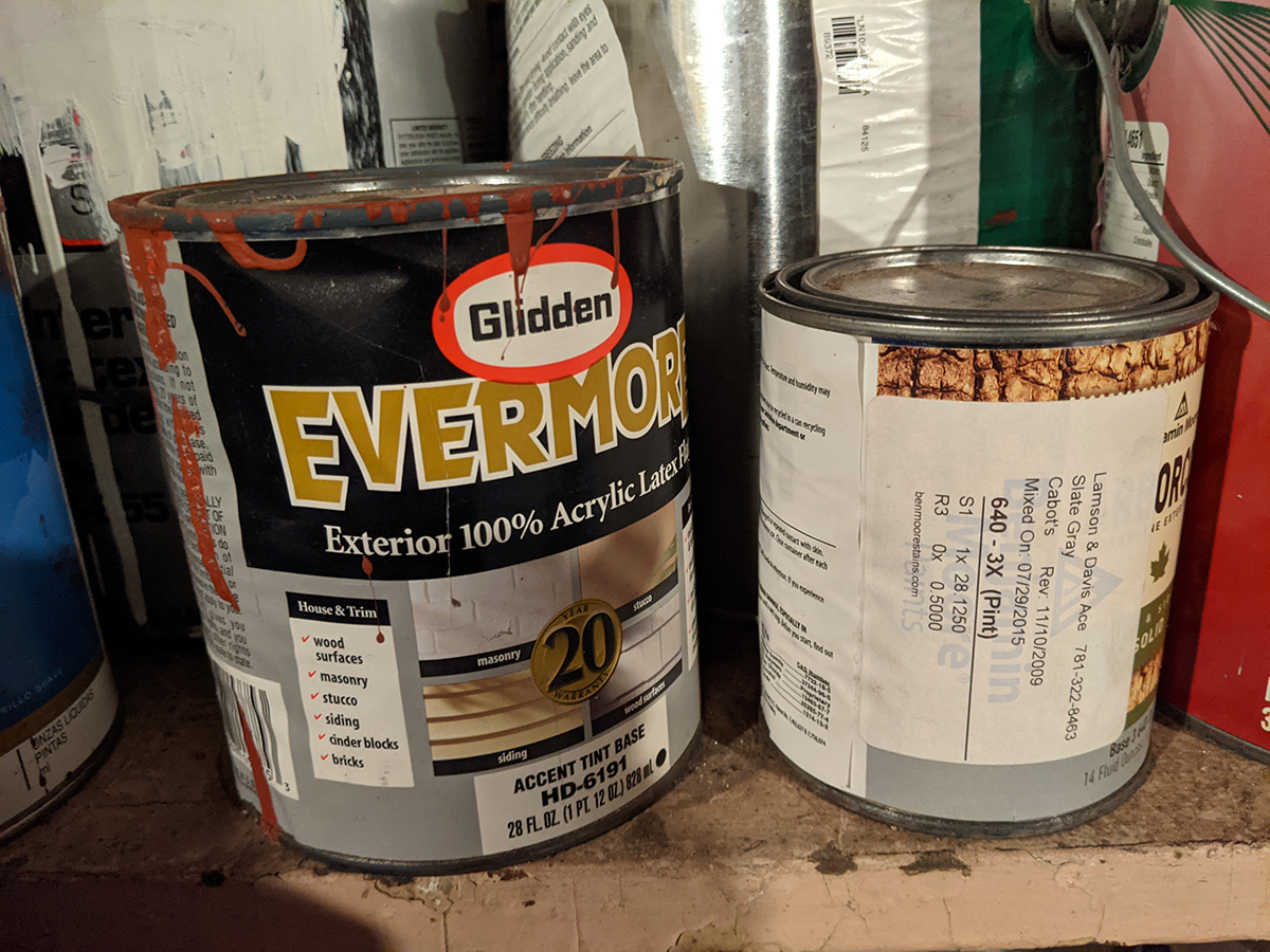 while in the basement i looked for some exterior paint. there are some spots on the staircase that could use some patching up. i'm not 100% sure which one is the biege color, although the slate and red are very evident. the three colors of the house are cabot colors slate gray, colorbook woodstock tan, and colorbook apple spice.