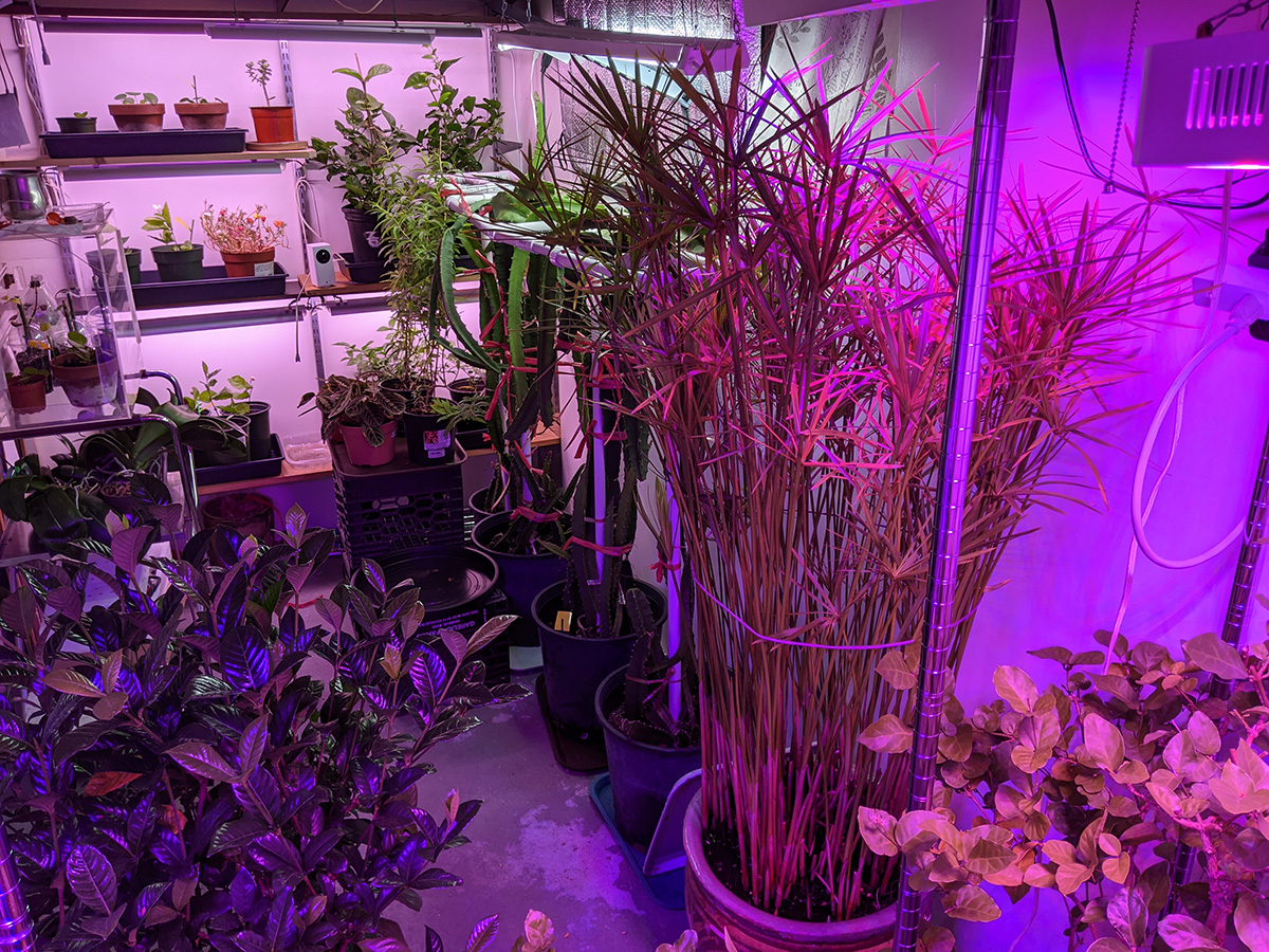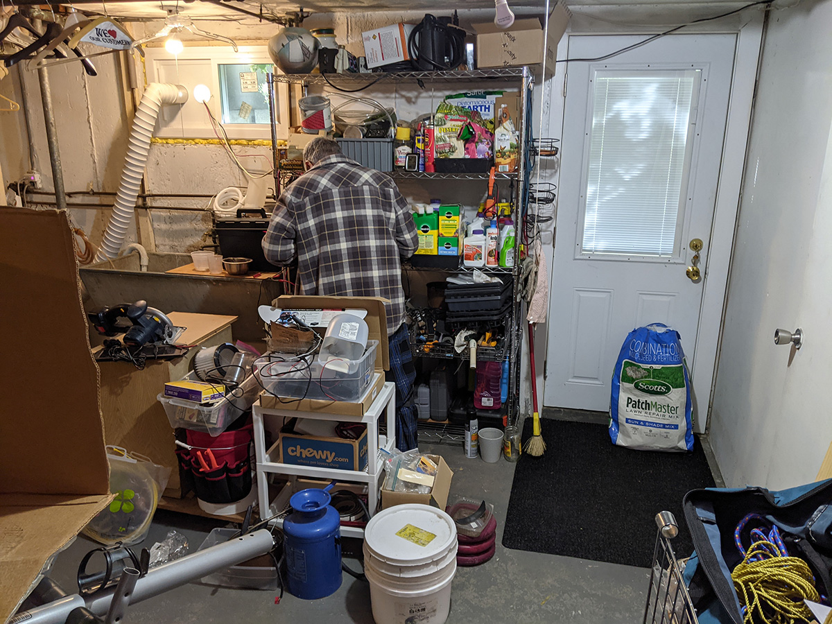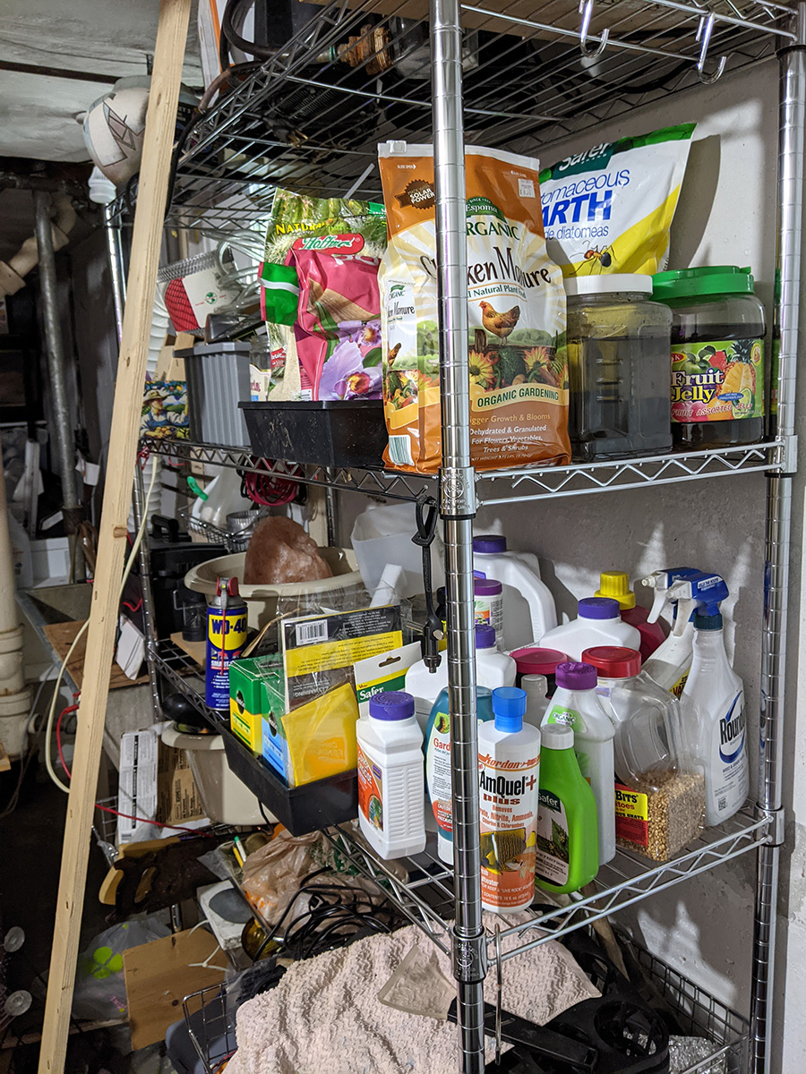 i cleaned up the wire shelves next to the basement sink to make room for all the plant related supplies from both the grow room and the sun room. the adjustable wall shelves in the grow room used to be the home for most of these items but now that we've converted them into grow shelves, the supplies needed a new home. i vacuumed the sunroom, the grow room, and the basement. my father also reconnected the deep cycle marine battery back to our on-demand backyard water pump.