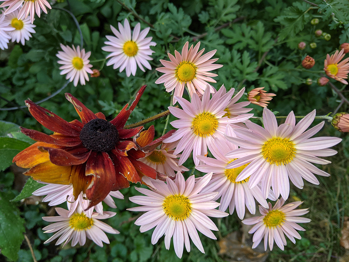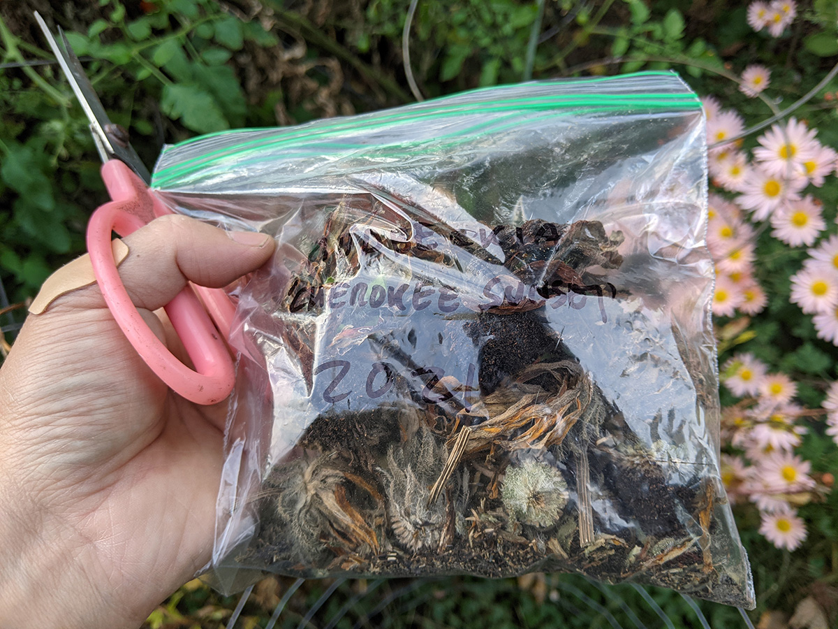 i watered some of my bare batch lawn spots. i turned the compost and added some half-cured compost to the larger wisteria pots, while the smaller ones got some potting soil added. i collected some more aster and rudbeckia seeds.
