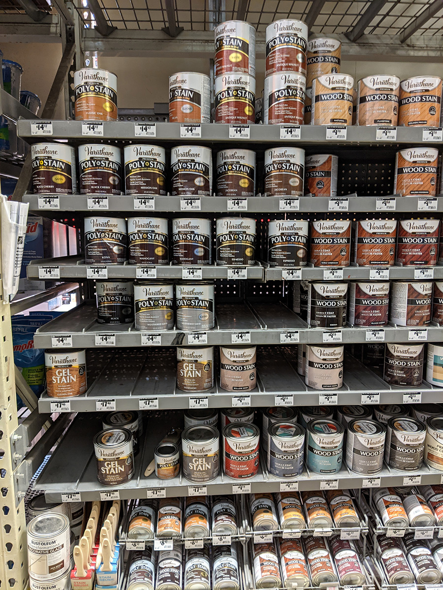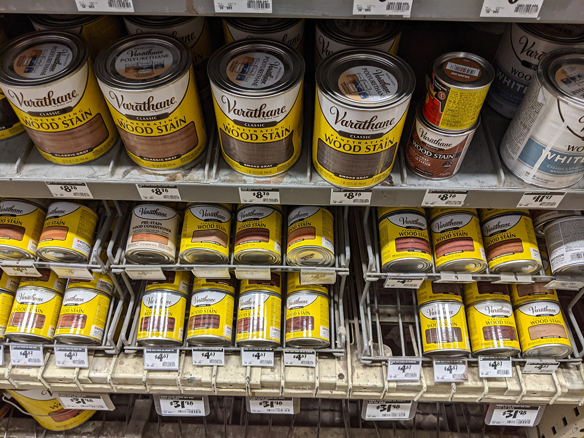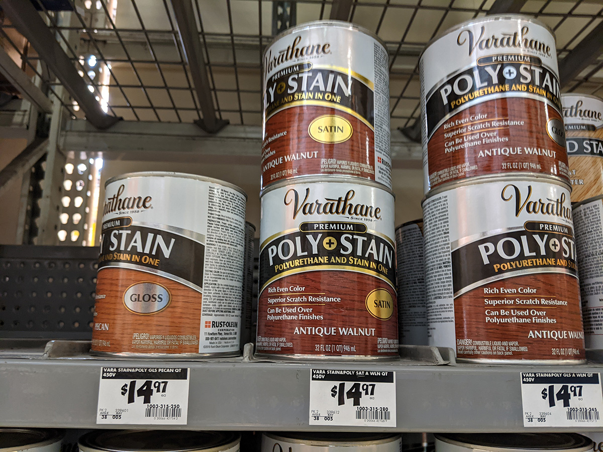 my father came back a bit later, he actually went home and got some oil-based polyurethane. it was varathane brand, we probably bought it at home depot. it seems suitable, but the only problem i have is it has a gloss finish. i prefer satin, or even semi-gloss. gloss makes the wood look like plastic. i'm sure it protects well, but it doesn't have that natural wood feel. changes are i'm going to go out and get a can of satin finish polyurethane. just so happens i also need to return a few things at home depot.