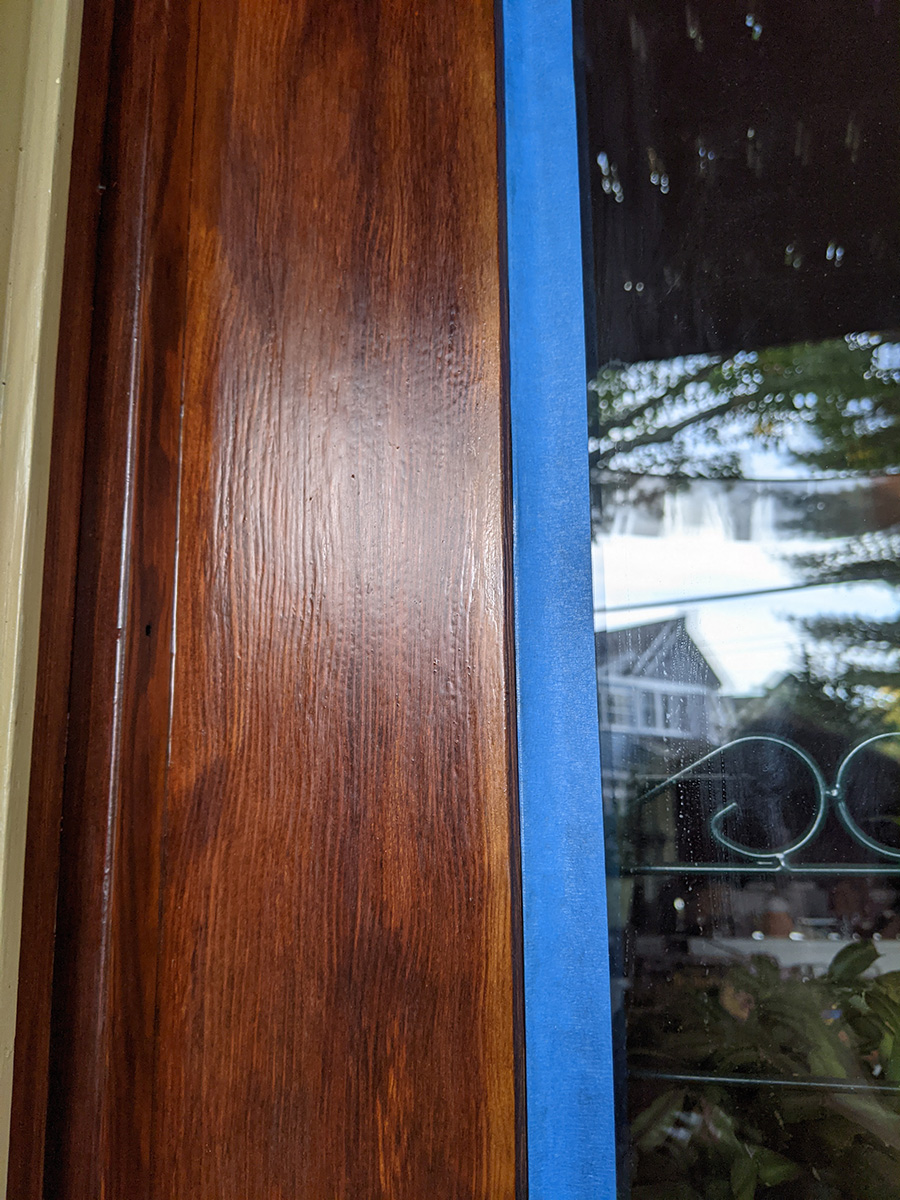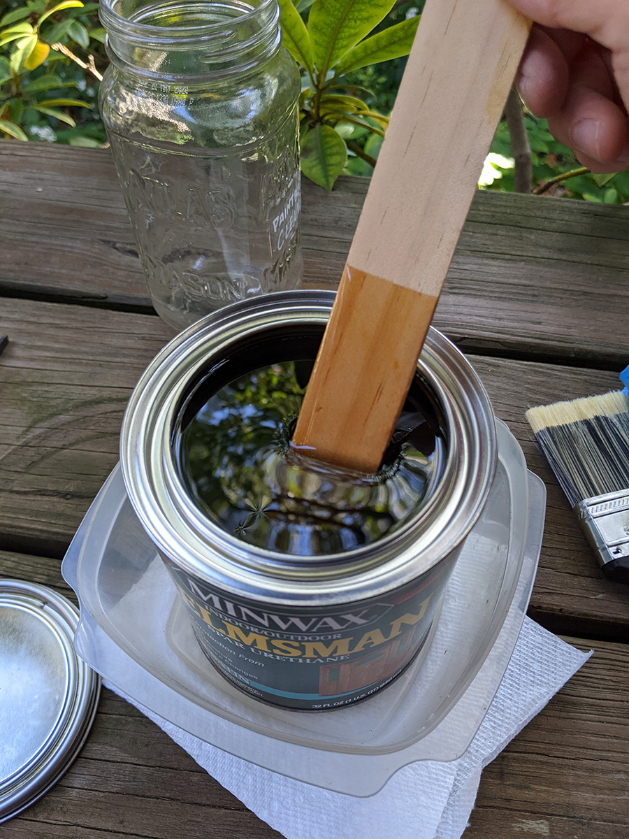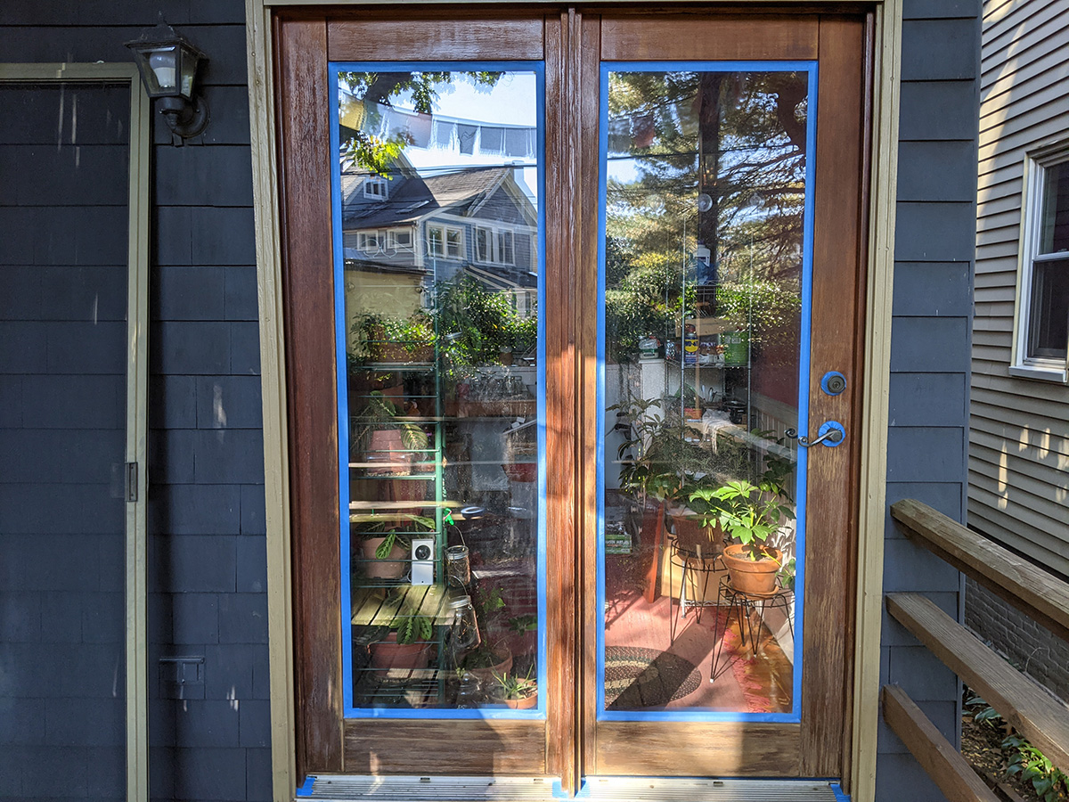like yesterday, i didn't have time for lunch. as soon as i got back, i was working on the door. i first sanded all surface of the door using fine 220 grit sandpaper. originally i was just going to treat the bare wood areas, but it's easier just to sand everything and apply sealant to the whole surface. i then wiped everything down with a damp towel. just the sanding took 40 minutes. applying the first coat of spar urethane took another hour. in the can it looked black, but it's actually clear with a slight amber color. i used one of the synthetic dollar store brushes, the medium size one. i was finally done by 3:30pm. the directions said the surface needs 4 hours to dry. i closed the door to a crack and left it there while i cleaned up.