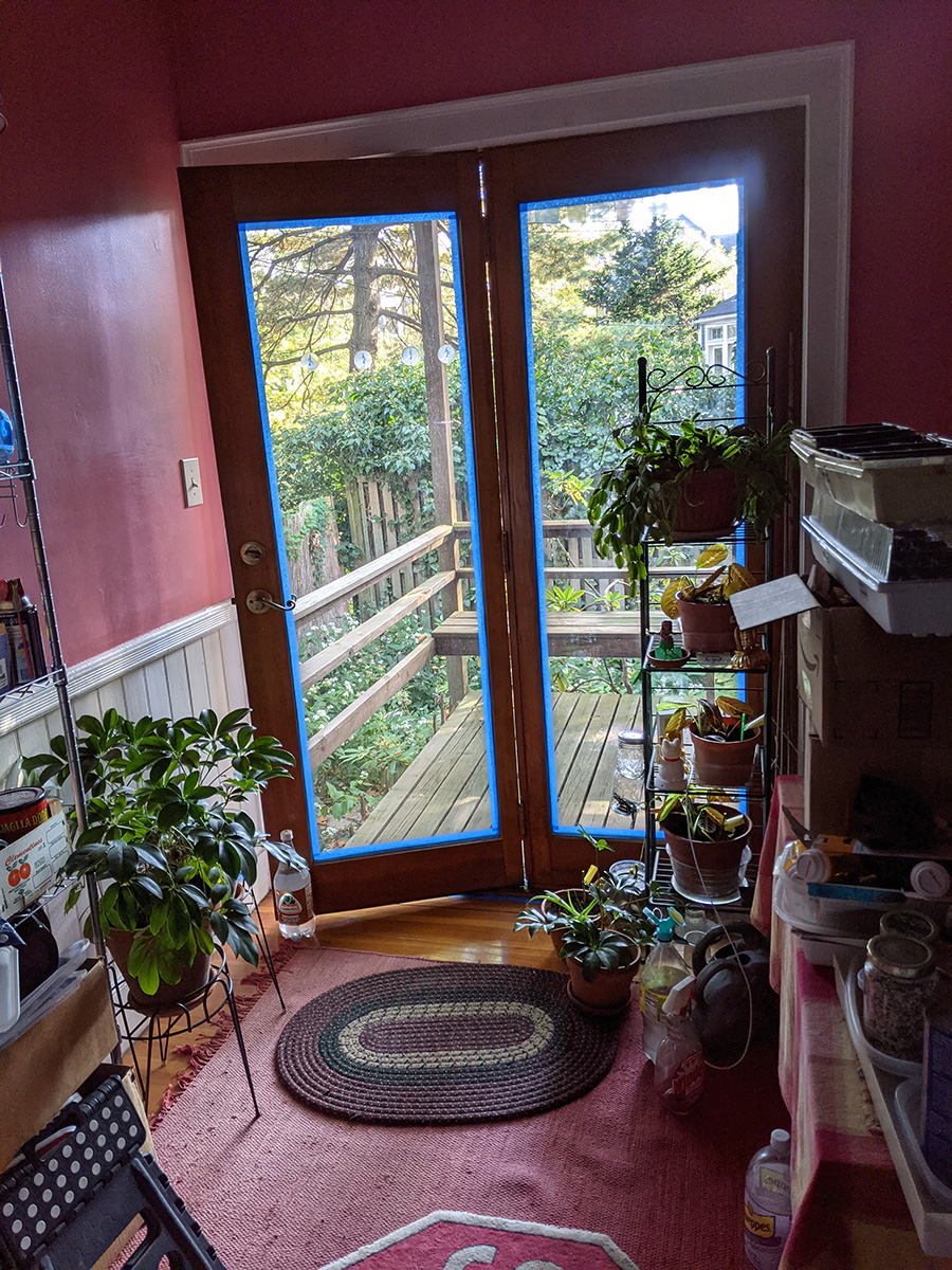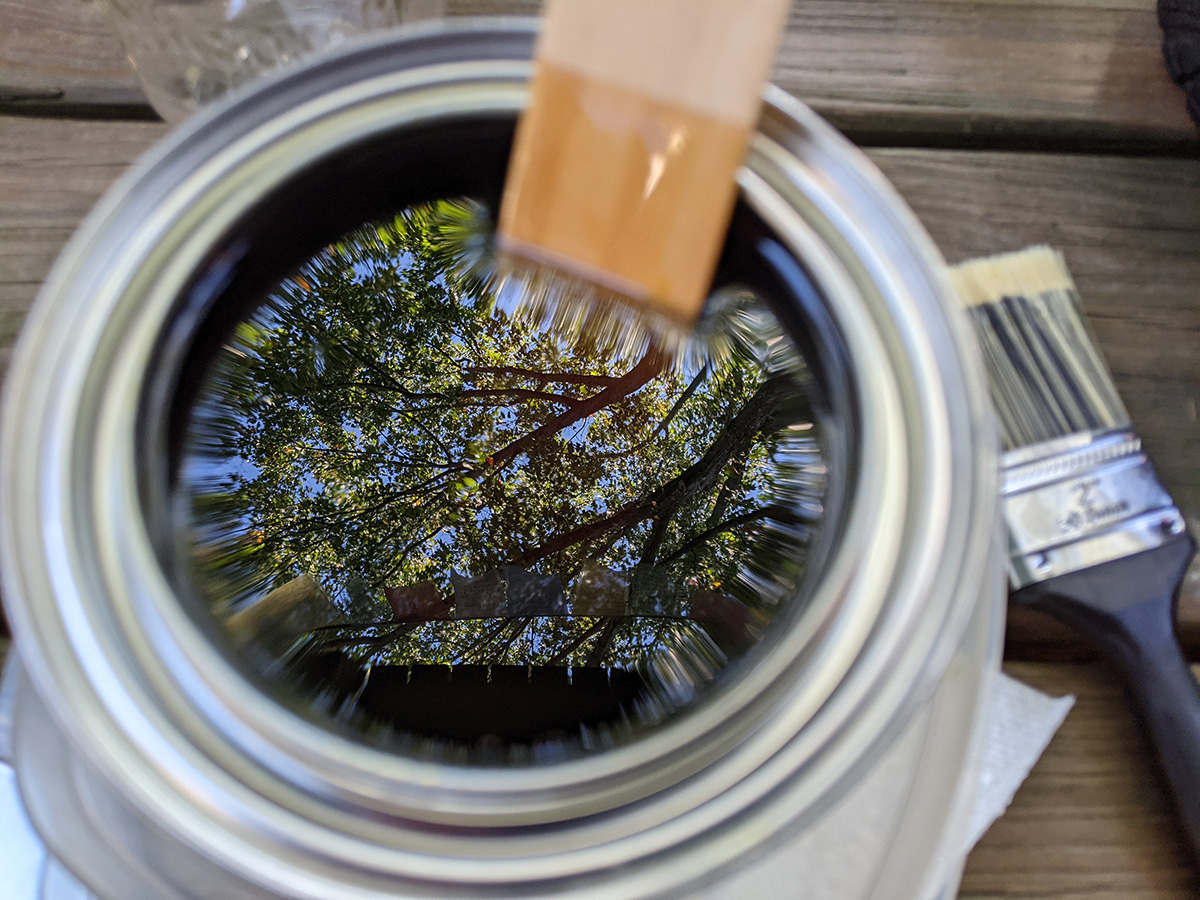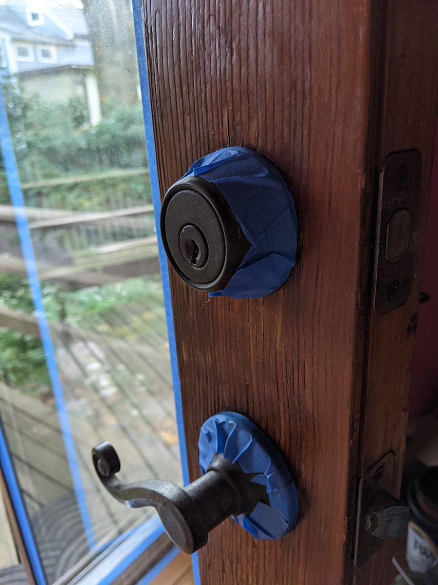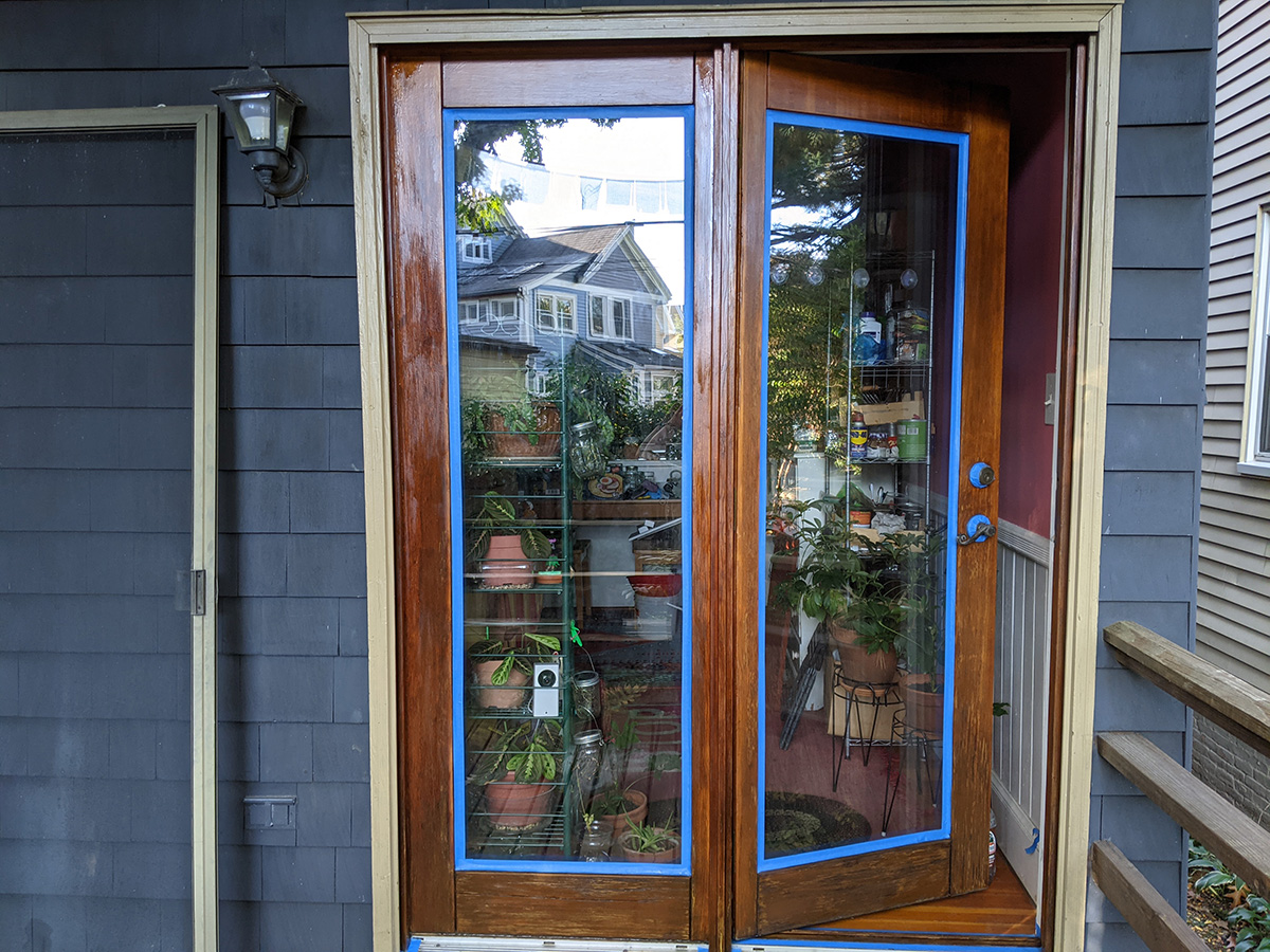 like yesterday, i didn't have time for lunch. as soon as i got back, i was working on the door. i first sanded all surface of the door using fine 220 grit sandpaper. originally i was just going to treat the bare wood areas, but it's easier just to sand everything and apply sealant to the whole surface. i then wiped everything down with a damp towel. just the sanding took 40 minutes. applying the first coat of spar urethane took another hour. in the can it looked black, but it's actually clear with a slight amber color. i used one of the synthetic dollar store brushes, the medium size one. i was finally done by 3:30pm. the directions said the surface needs 4 hours to dry. i closed the door to a crack and left it there while i cleaned up.