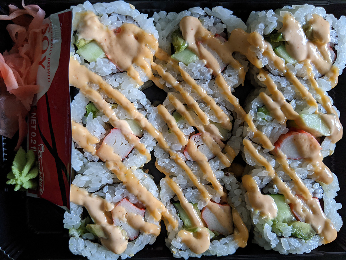 around 4pm i walked down to the UPS store to drop off the fridge gasket and 3 bags of unwanted coffee pods. since i was just a few blocks away from market basket, i went there to get a few grocery items. i bought a pan of spicy california roll for a late lunch.