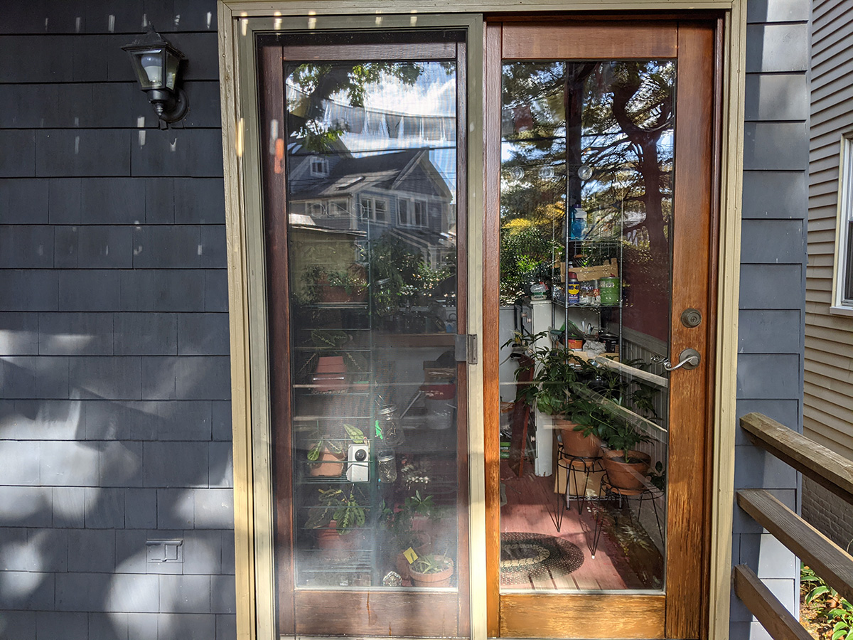 i removed the blue tape from the french door this morning then spent some time washing the windows. i also installed some insulating foam around the edges of the door to seal the gaps. it fit perfectly underneath the door (without rubbing up against the bottom), but when i looked from the inside i could see tiny gaps, so i'll still need the door snake to keep the cold out. with that my door coating project is over. i might want to remove the screen door for the winter, to allow more light into my kitchen; i've realized when the screen is there, it blocks some of the sunlight. besides, the screen needs to be replaced, it was ripped by careless contractors who walked through the door when i first got the place and i never fixed it.