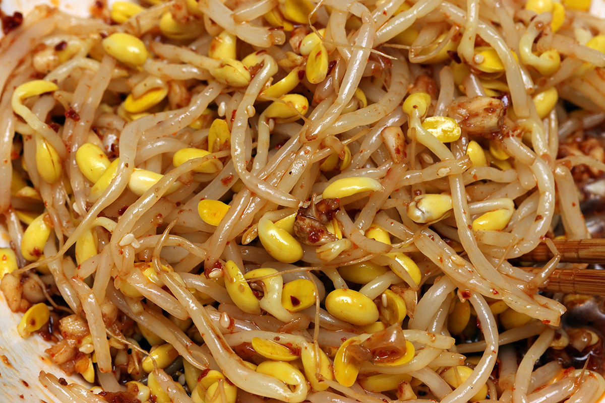 while making the seaweed dried fish broth used for the rice cake base, i also prepared the bean sprouts by first boiling them for a few minutes before soaking them in an ice bath. i then mixed the flavors: red pepper flakes, sesame oil, vinegar, soy sauce, chopped garlic, sugar, salt, and sichuan chili pepper oil. when i was bringing the bean sprouts into the dining room for my parents to try, i accidentally dropped the bowl onto the floor. good news was only 1/3 of it spilled out, but bad news was we had to clean the carpet of oils.