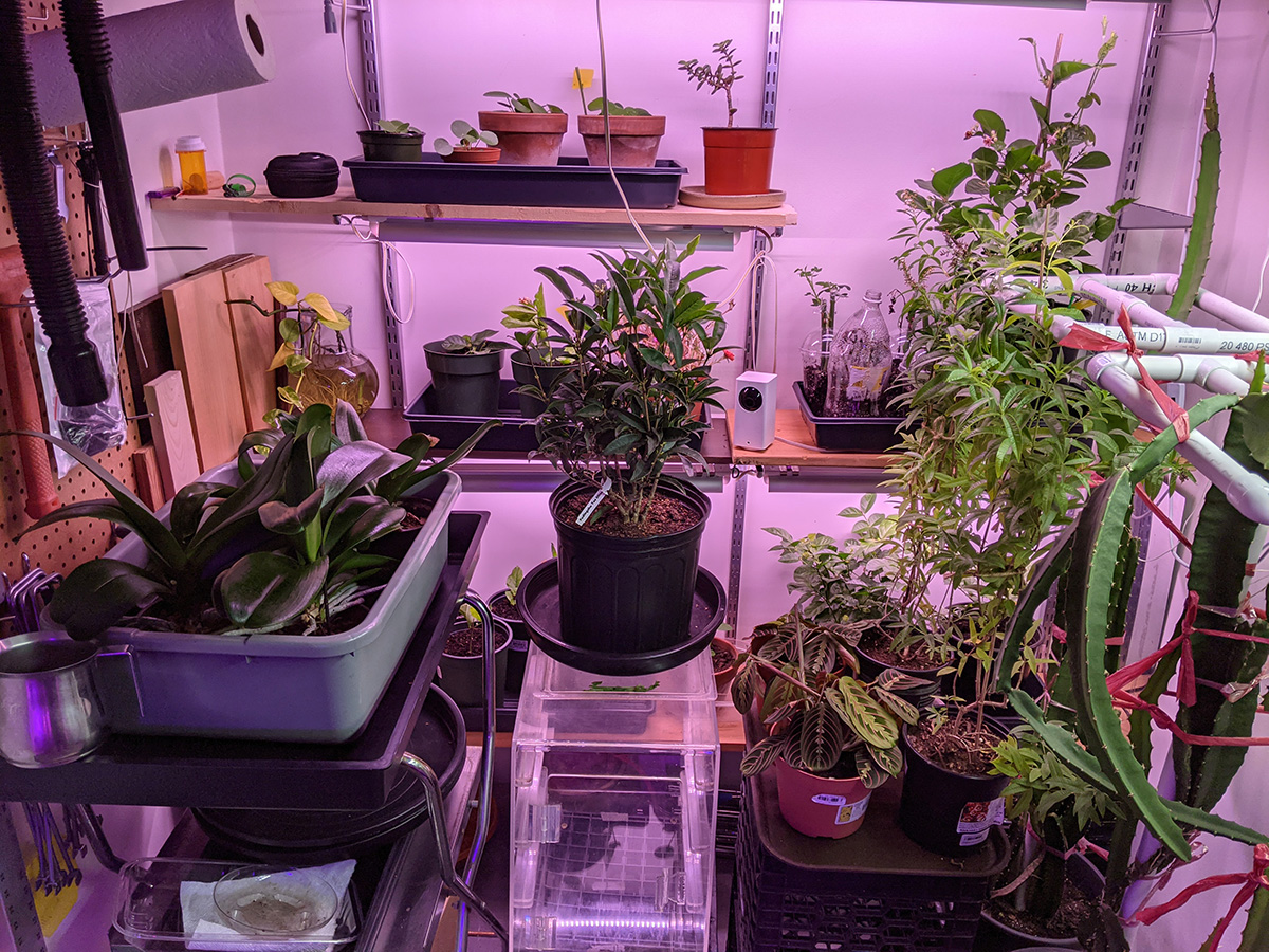 my parents had turned on the heat last night so it was warm in the enough. i noticed the osmanthus was missing from the living room, my mother said my father brought it down to our basement grow room because it didn't seem to be doing very well. down in the grow room, it'd have all the light and warmth and humidity that plants love.