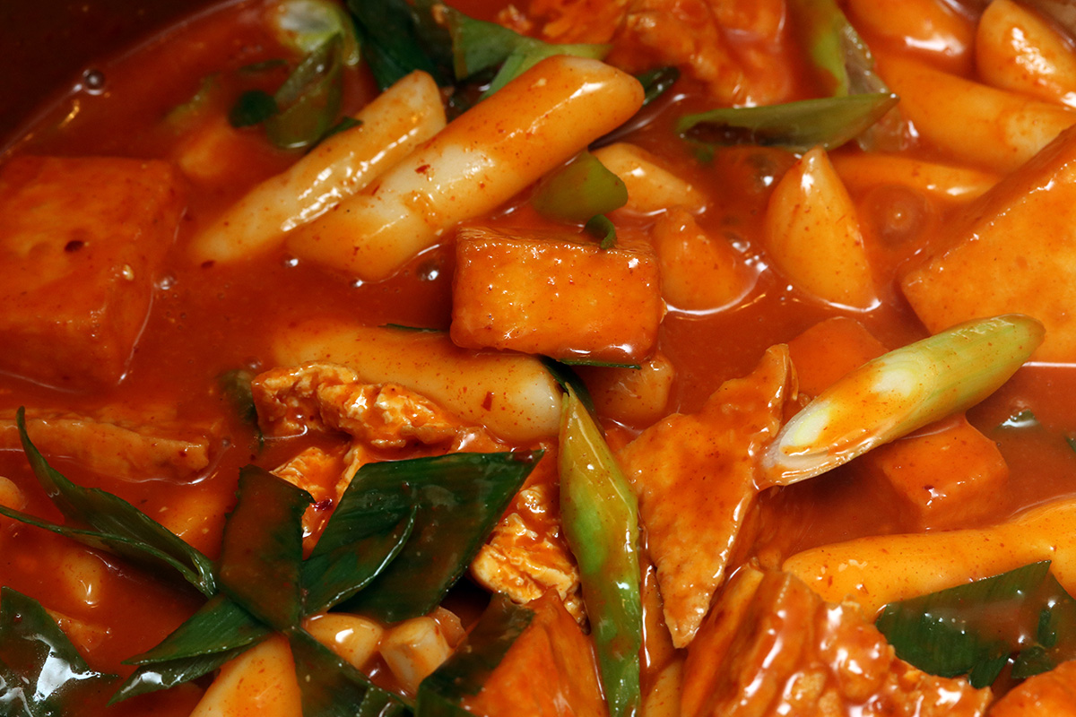 when the 2nd broth was finally ready, it seemed like we might've had too much broth as the rice cake sauce was very watery. but the more i heated (after adding 1/3 cup of gochujang and 1 tbsp each of dark corn syrup and red pepper flakes) the thicker it got, and it seemed like just the right amount to cover the rice cakes, frozen fish tofu, and tofu wedges.