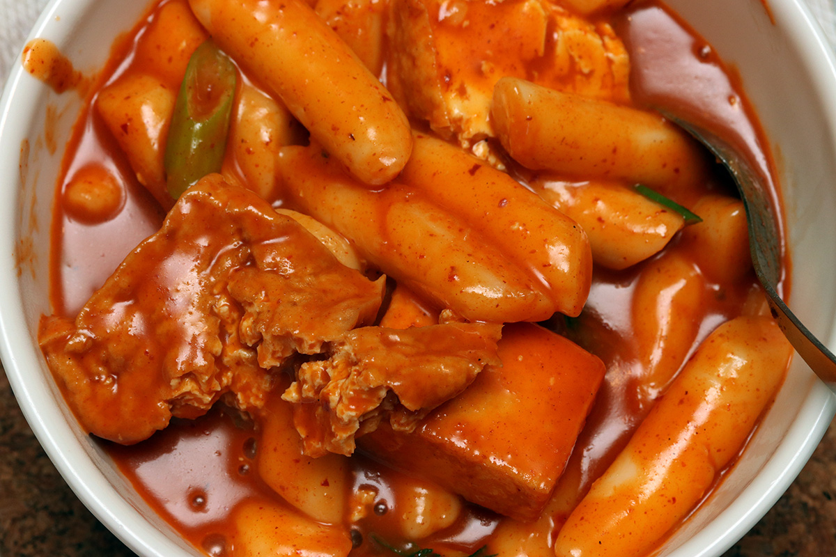 the final result was a good dinner, that starchy goodness of the rice cakes and the protein-filling tofus combined with the spicy sauce paired with the cooling bean sprouts and cucumbers.