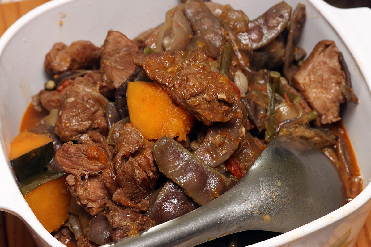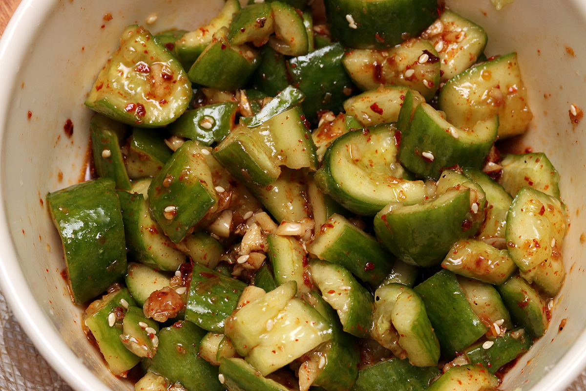 for dinner my parents made a stew of leftovers again, hyacinth beans, long beans, braised pork, and buttercup squash, along with some fat glass noodles. my mother asked me to make a bowl of smashed cucumbers.