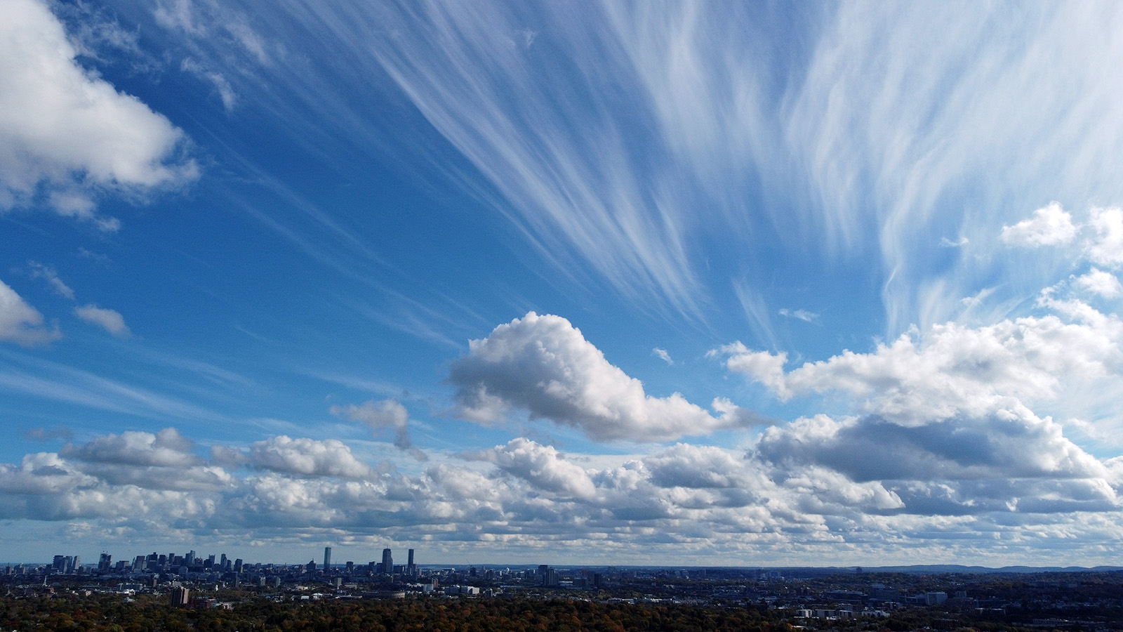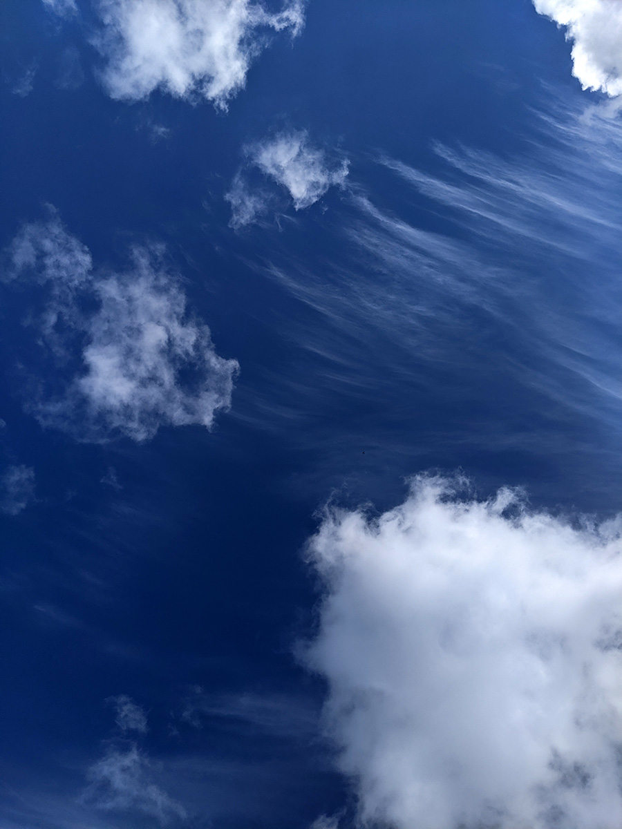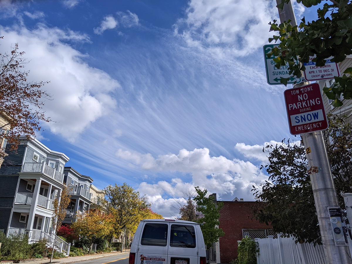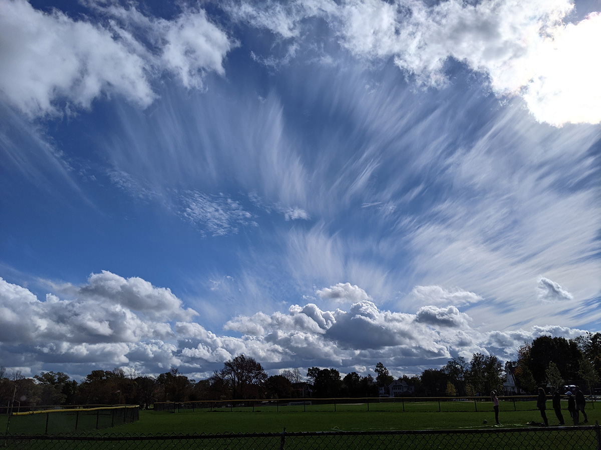 i ended up staying there for nearly 1-1/2 hours. i didn't leave until after 1pm, cutting into valuable gardening time on this rare mid-60's degrees late october day. in the sky were some very dramatic clouds, and i even glimpsed a fragment of a rainbow through the airborne water droplets in the cirrus clouds. when i passed by the park i had to stop to take some photos, the clouds were super dramatic. i hurried home and ran into the backyard to fly the drone and get some better pics. unfortunately the samsung S9+ phone wasn't charged and had zero power. i came inside to quickly charge it up to 2%, managed to fly about a minute, before the phone went dead and i had to manually land the drone by sight. i then used my pixel 3XL phone. all was fine at first, but like before,