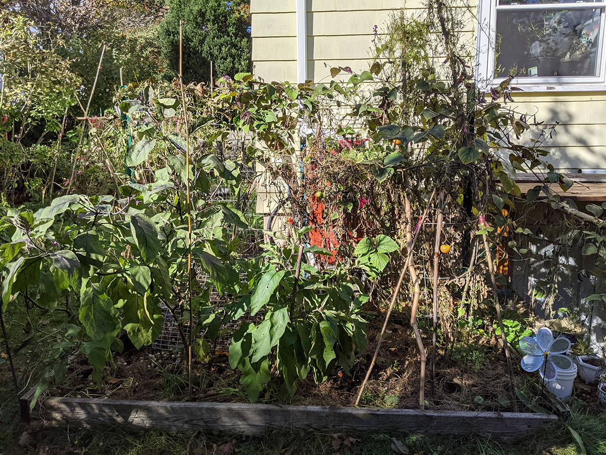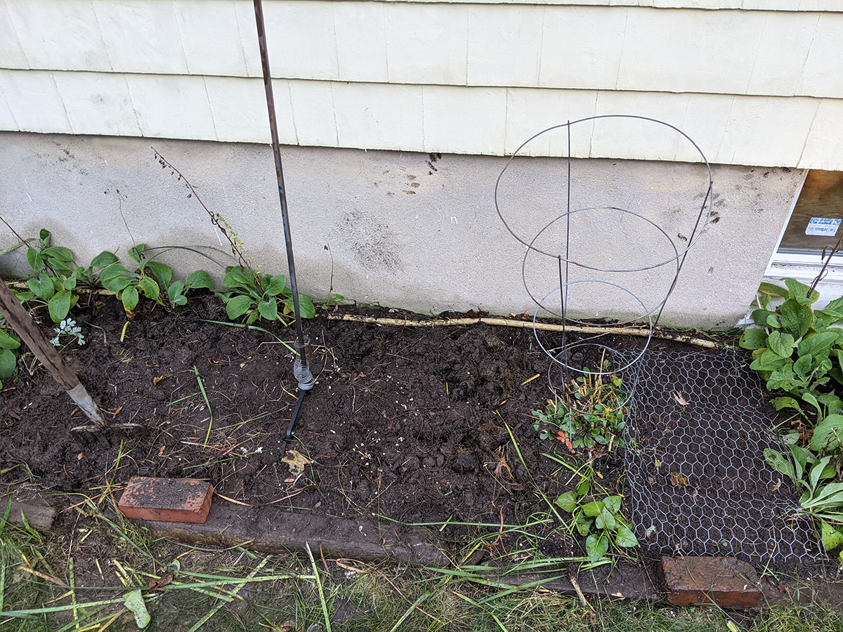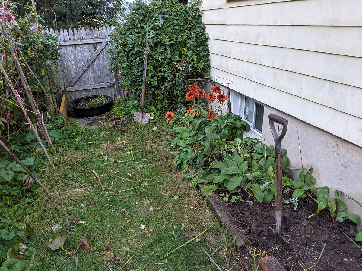 i continued working in the backyard, planting the foxgloves, the gladiola corms, some crocuses, and a solitary columbine. earlier i worked two buckets worth of grass compost into the soil. i saved the siberian irises for tomorrow, collected them in a water filled bucket. i went back inside by 4:40p.