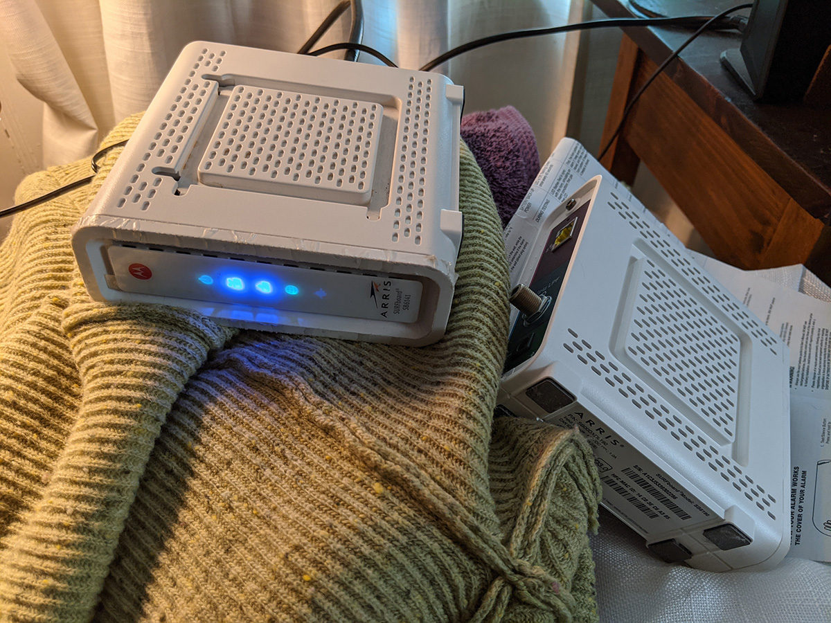 my sister's cablemodem was still dead, steady power on, blinking upload, all other lights were off. on the floor nearby was the old modem we replaced. out of curiosity, i plugged in that modem while i went to go check on the cables outside. they seemed fine, i didn't see any undue slack, and the splitter seemed okay. when i went back inside, i was surprised to see the old modem with all 4 lights on, with upload and download blinking. could the new modem be broken? wasn't the old modem broken too? but how come all the lights are on?