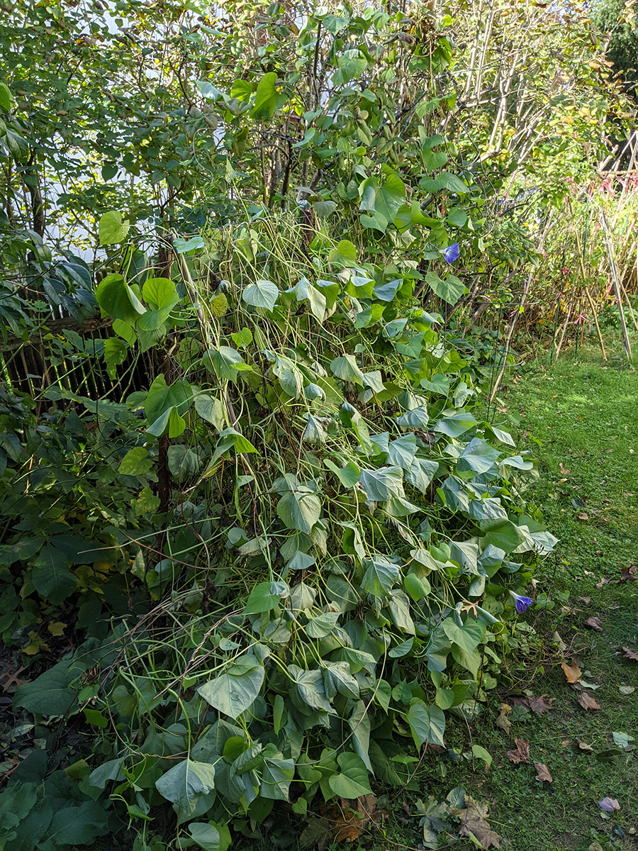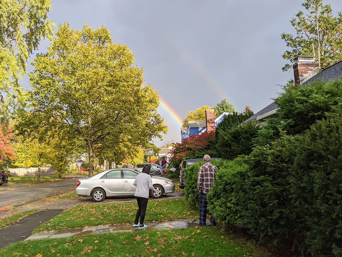 around 2pm my father and i went out to do some gardening. i had to be back inside by 4pm to watch the patriots game. the morning glory trellis by the quince bush had toppled over. while my father was busy detangling the trellis, i was digging up the rest of the siberian irises in the western perennial bed. later my father helped me trim the irises and sort out the larger ones suitable for planting. mixed in with the irises were foxglove plants which i carefully removed and set aside to plant later. i also dug up about a dozen gladiola corms. before we could plant however, it started raining unexpectedly by 3:30pm, forcing us back inside. i knew it was just a passing shower, and by 3:45pm i was back outside. i had a feeling we might see a rainbow since it was a sun shower event, so i looked with my back to the sun facing the direction of the moving showers, and sure enough, i saw a rainbow. not just *a* rainbow but a double rainbow! i ran inside to tell my parents and we went to the front of the house to check out the rainbow.