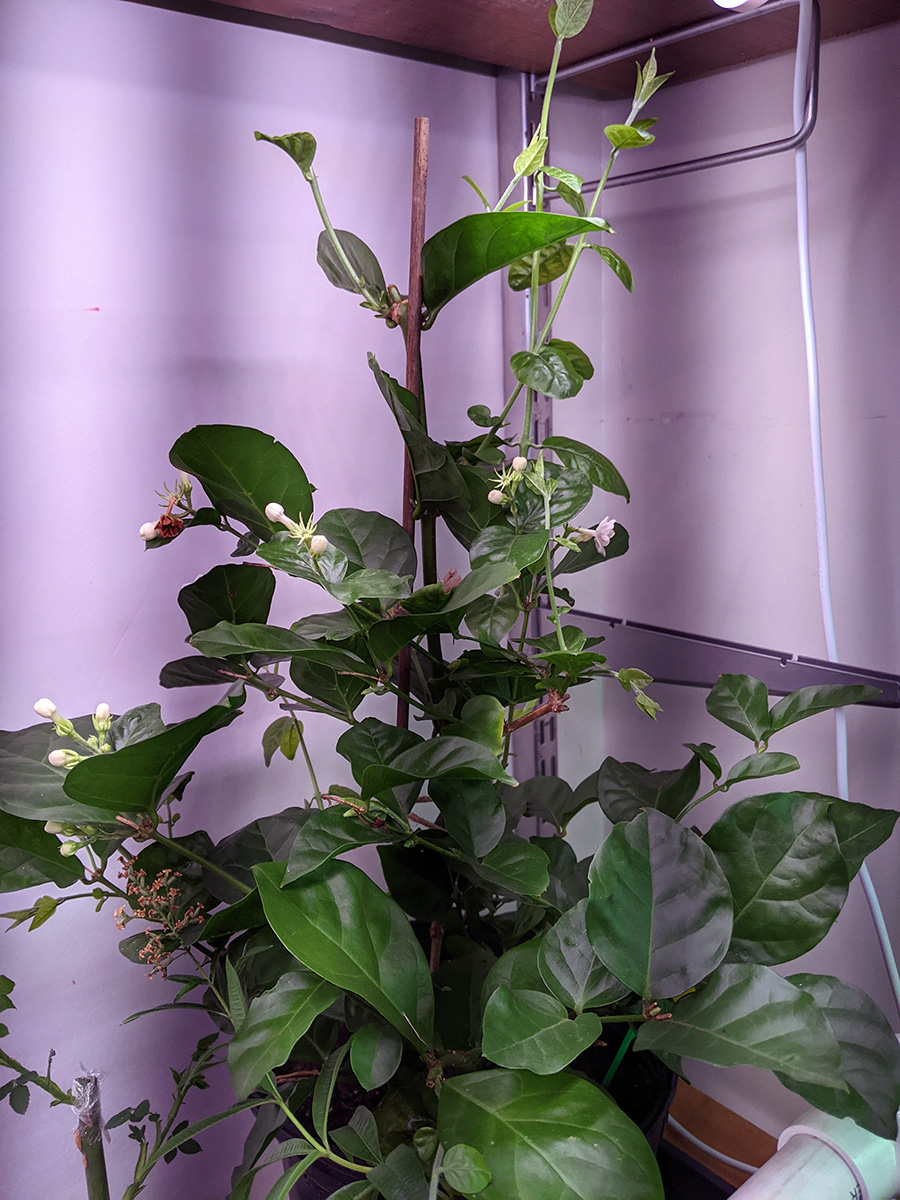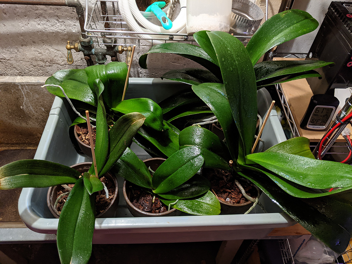 downstairs in the grow room, i sprayed the orchids again with neem oil. i didn't see any mealybugs, but i'm going to keep on spraying every week just to be safe. so far i haven't seen aphids or mealybugs in any of the other plants. the pepper plant (upstairs) has some aphid signs; i took it into the bathtub and sprayed it with insecticidal soap. the grow room feels like a sauna, temperature in the 70's with humidity at 70%. at night though it drops into the 60's and likewise with the humidity. it's great for our tropical plants, feels like being in the jungles. i ended up filling 3 buckets with rain water and carrying them down into the basement. i was going to do a soil drench with Bti infused water, but my father said to hold off until next weekend since the soil is still pretty most. i brought in the water so they'll be at room temperature when we eventually water.