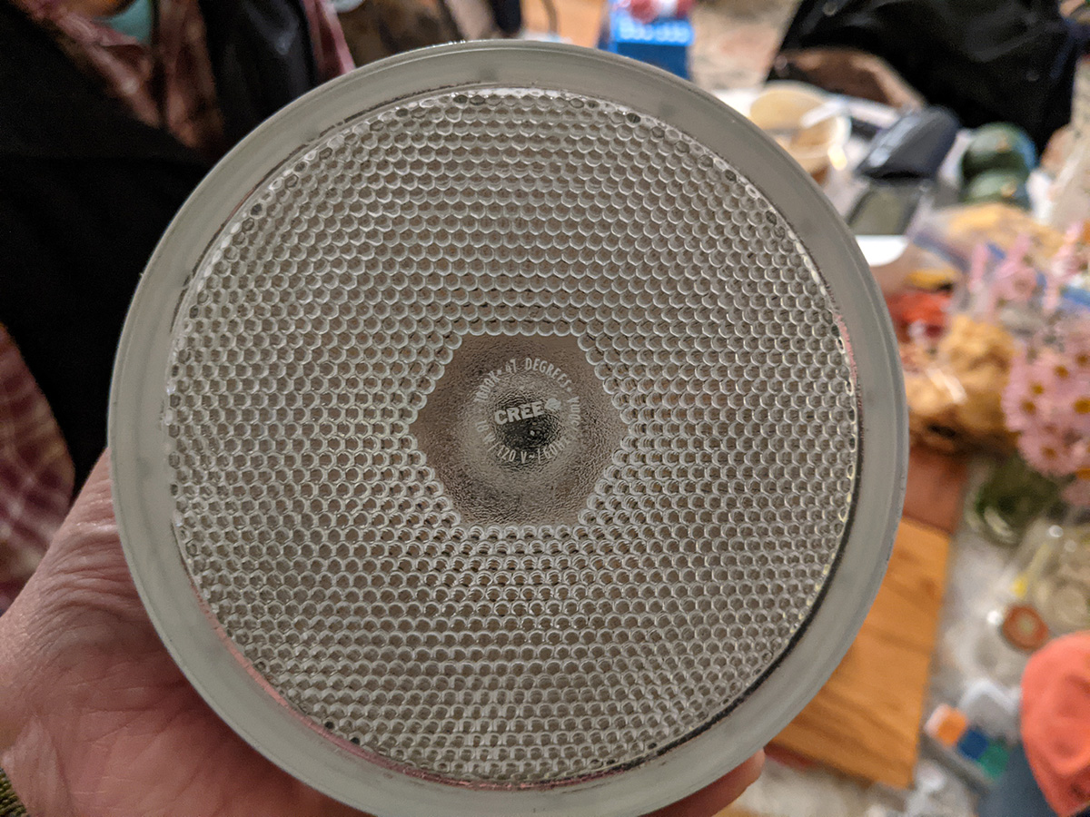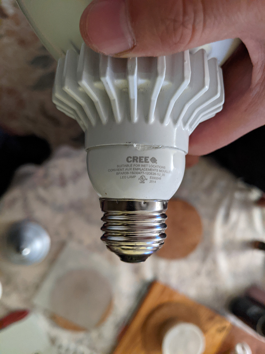 i tried replacing the dinner table light with the new PAR38 led light bulb from costco. it's the equivalent of a 75W, so it wasn't as bright as the bulb we currently use, a cree-brand led light. i can't figure out when i got that cree light (this model most likely, cree 18W [90W equivalent] 3000K PAR38 47° dimmable 1500 lumens), i think sometime in december 2012, so nearly 9 years ago. it's one of the early generation led light bulbs, so it has heat-dissipating fins.