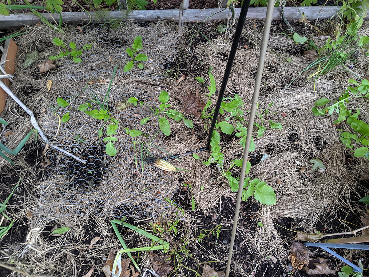 my mother came out briefly to inspect the garden for plants she can harvest. she saw a large bitter melon; unfortunately it's already turned yellow and soft, too ripe to eat, better just to leave outside and collect the seeds afterwards. i saw a common stinkhorn (Phallus impudicus) behind RB1. i've seen my share of stinkhorns over the years, i don't think i've ever seen this one before but i recognized it right away. the stinkhorn that usually appears in the backyard is the elegant stinkhorn. that whole area between and behind the raised beds that we've mulched with wood chips gets a lot of weird mushrooms. there's a colony of bird best mushrooms i've noticed for a while. maybe because it gets so wet there, and combined with the wood chips make for good mushroom growing conditions.
