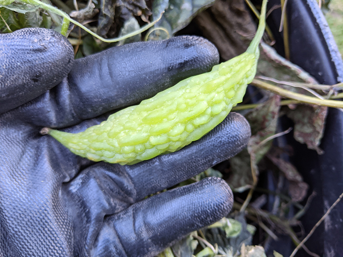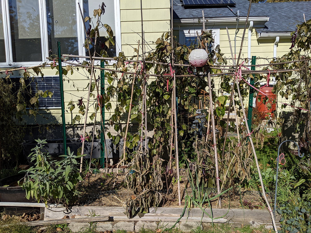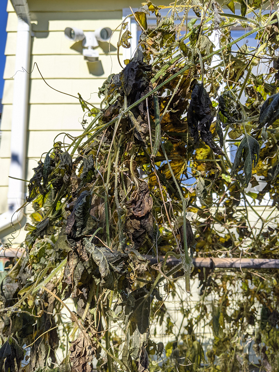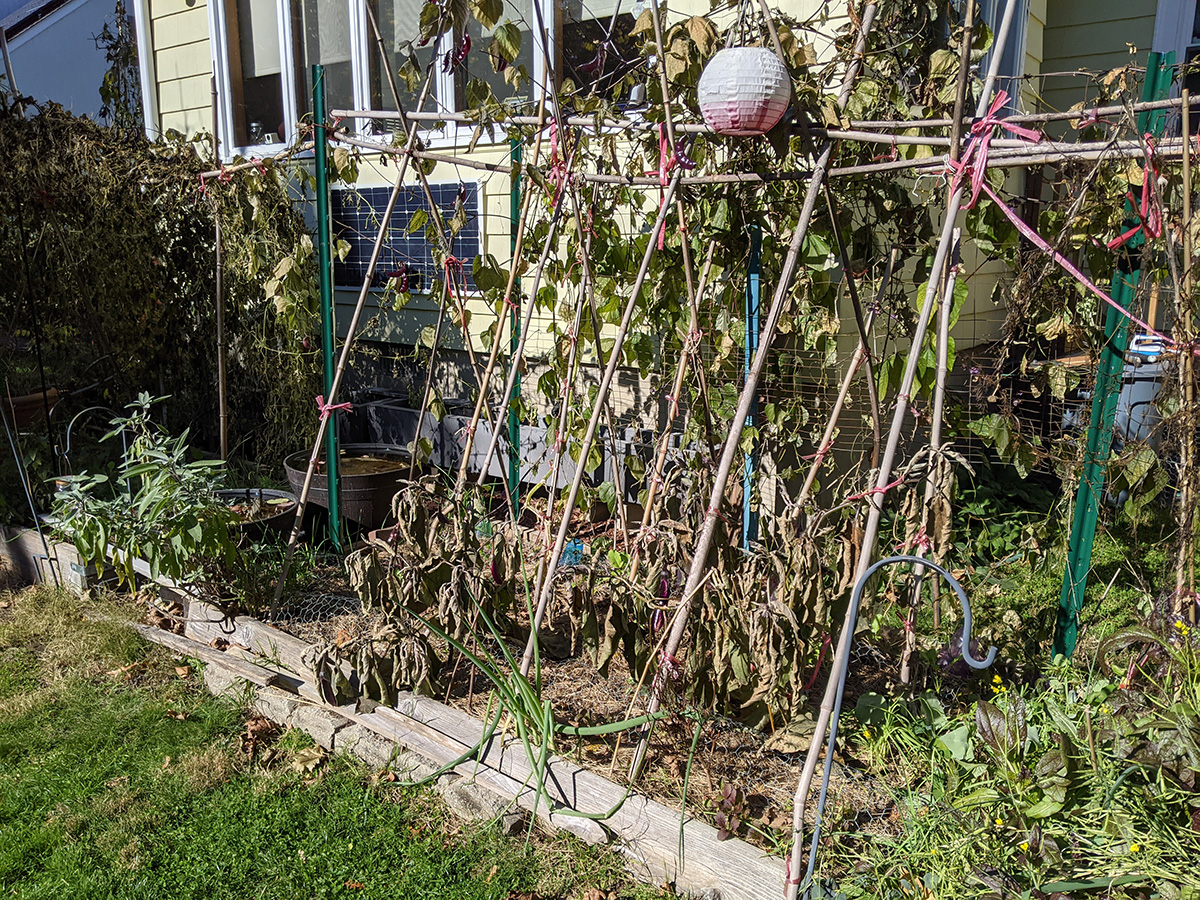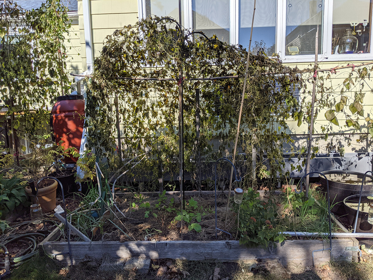 we continued with our clean-up, tearing off the vines from the raised bed trellises. bitter melons are easy to tear down, their stems can be pulled apart with a bit of force. hyacinth bean vines on the other hand need to be cut, they grow in tight spirals and their stems get woody as they mature.