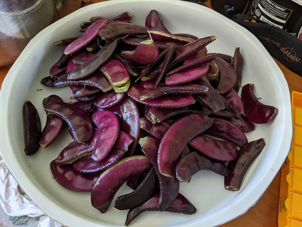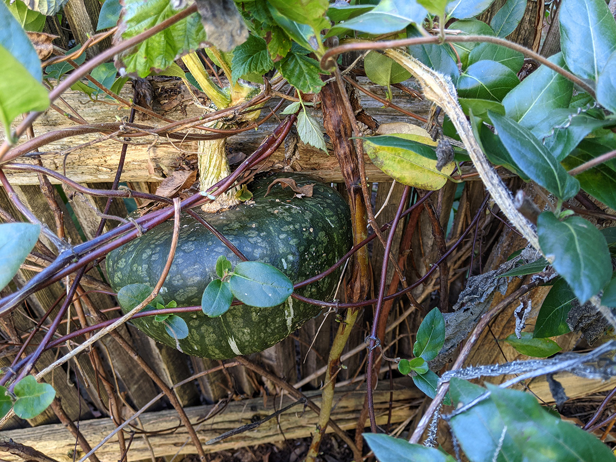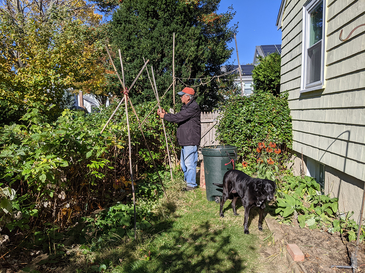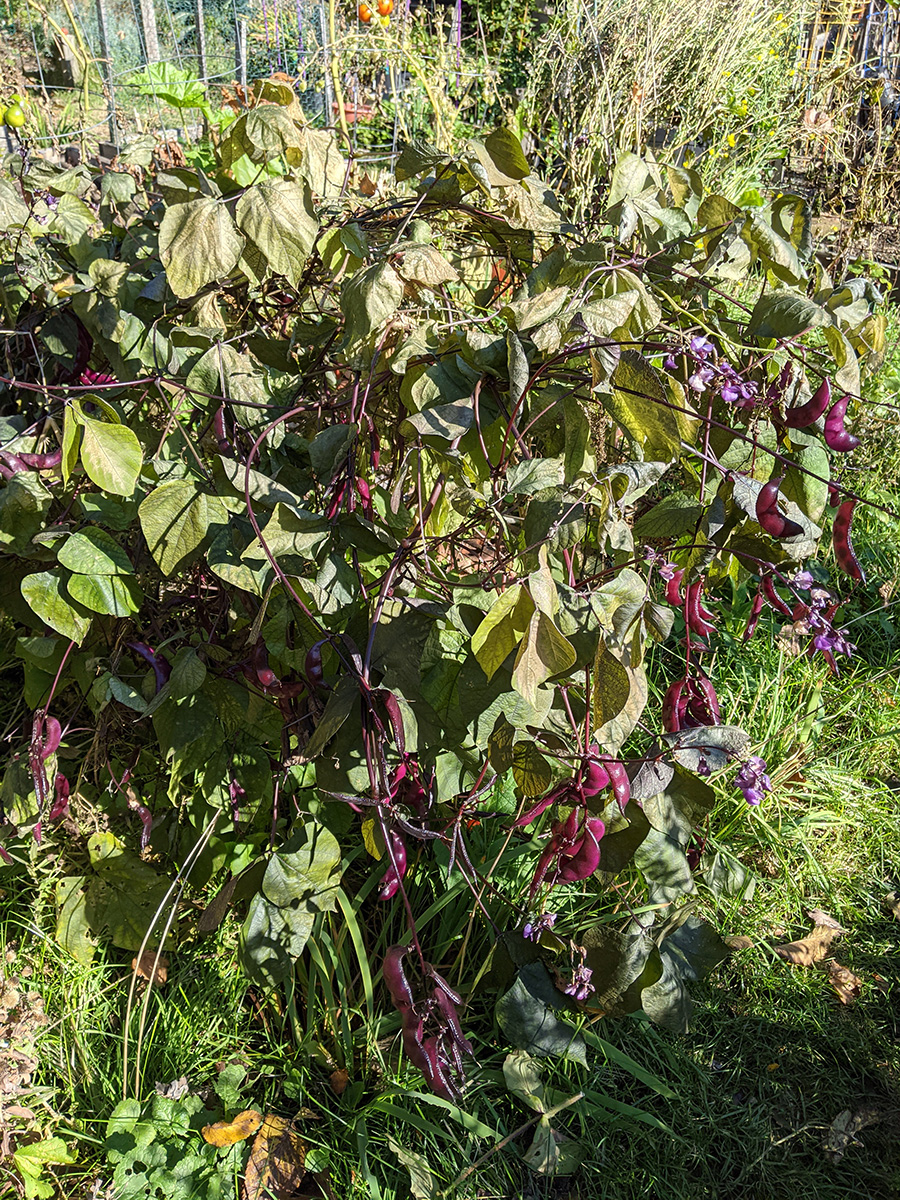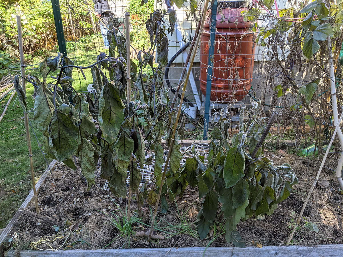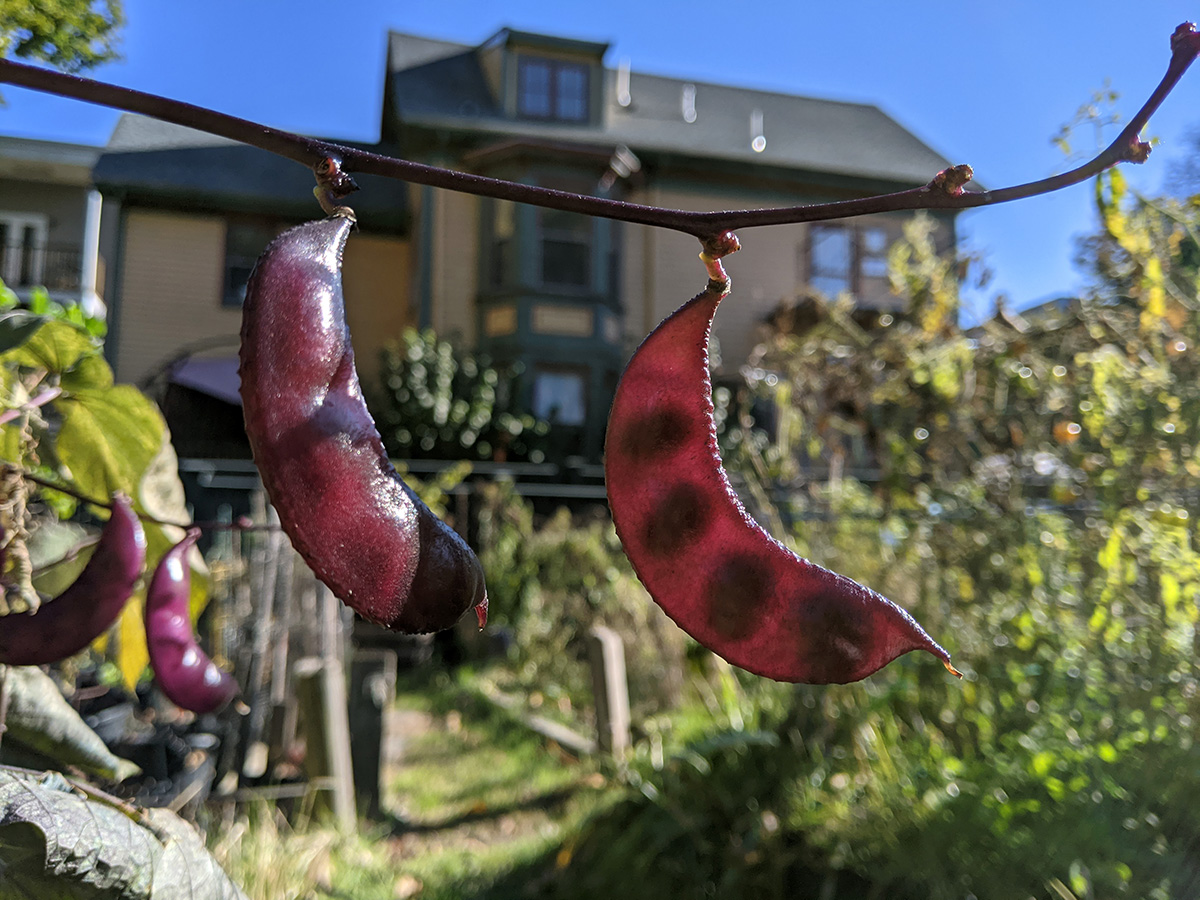 we continued with our clean-up, tearing off the vines from the raised bed trellises. bitter melons are easy to tear down, their stems can be pulled apart with a bit of force. hyacinth bean vines on the other hand need to be cut, they grow in tight spirals and their stems get woody as they mature.
