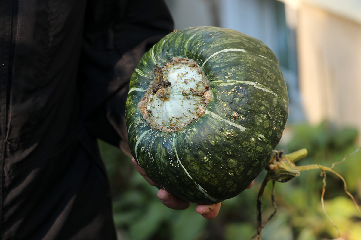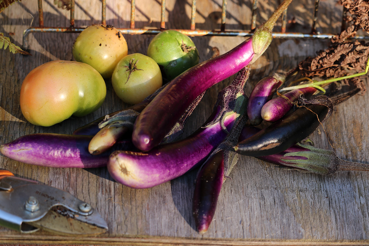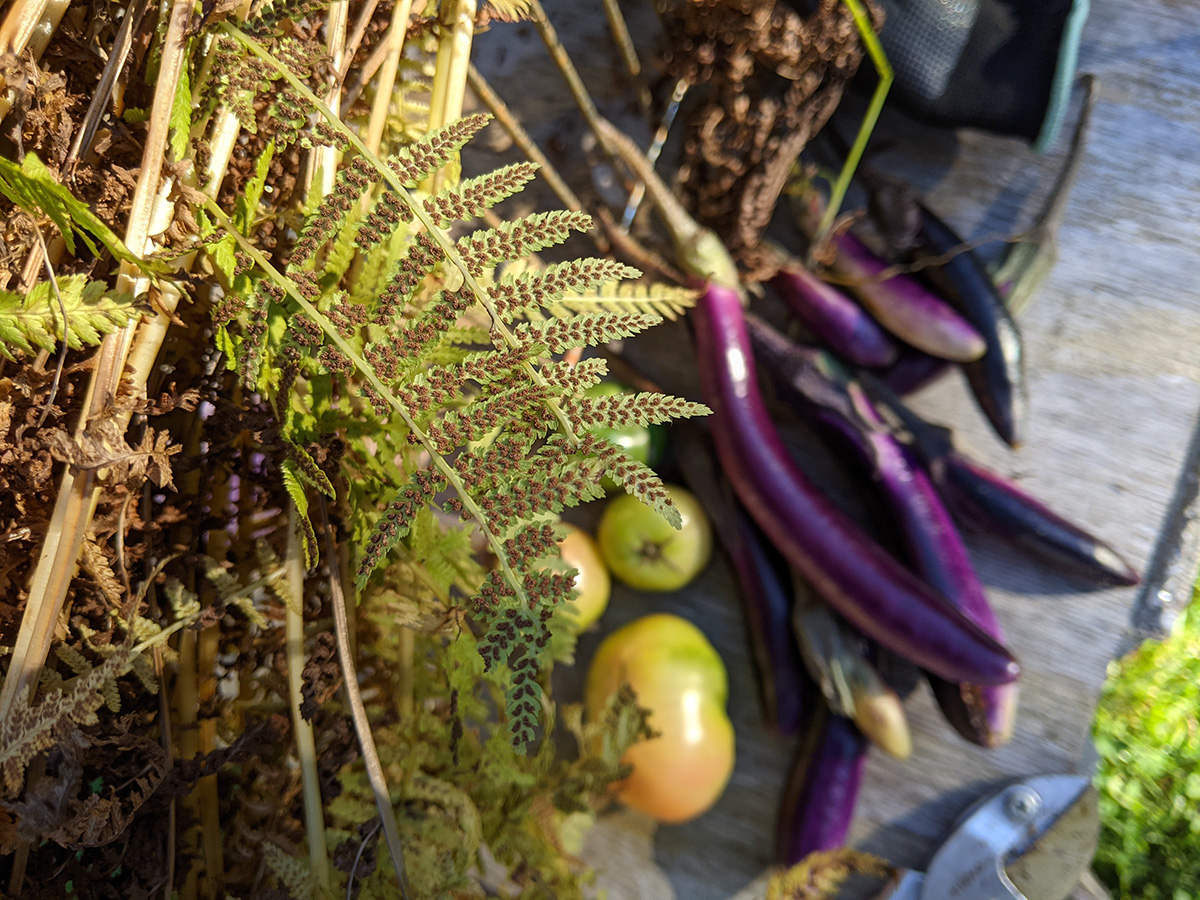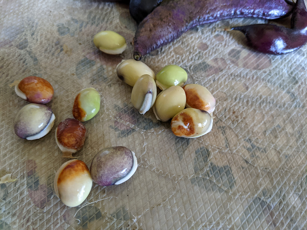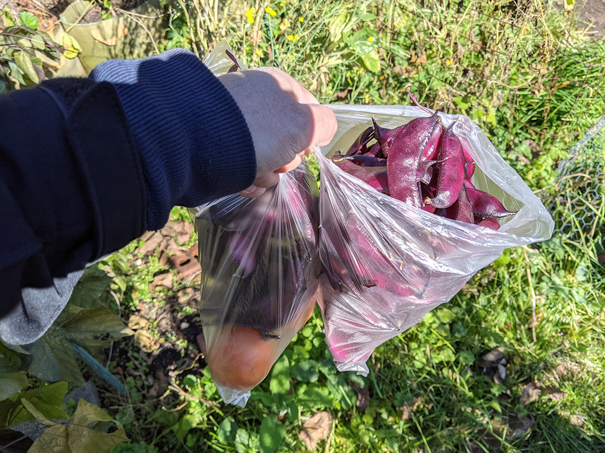 we continued with our clean-up, tearing off the vines from the raised bed trellises. bitter melons are easy to tear down, their stems can be pulled apart with a bit of force. hyacinth bean vines on the other hand need to be cut, they grow in tight spirals and their stems get woody as they mature.