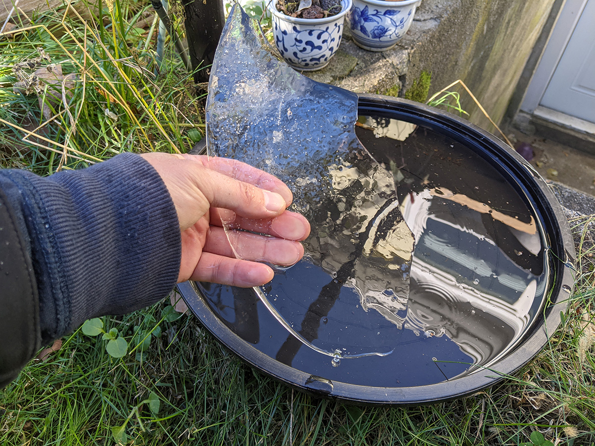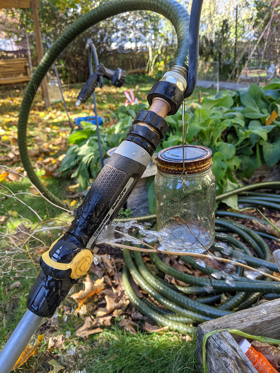 while my mother was sorting through the hyacinth beans i brought home and preparing wontons for lunch, i was out in the backyard with hailey. my father was taking down the western bamboo trellises. when i went to go water my grass seedlings, i got sprayed with water: the melnor watering wand must've gotten damaged in the freezing temperature and suffered cracks in the casing.