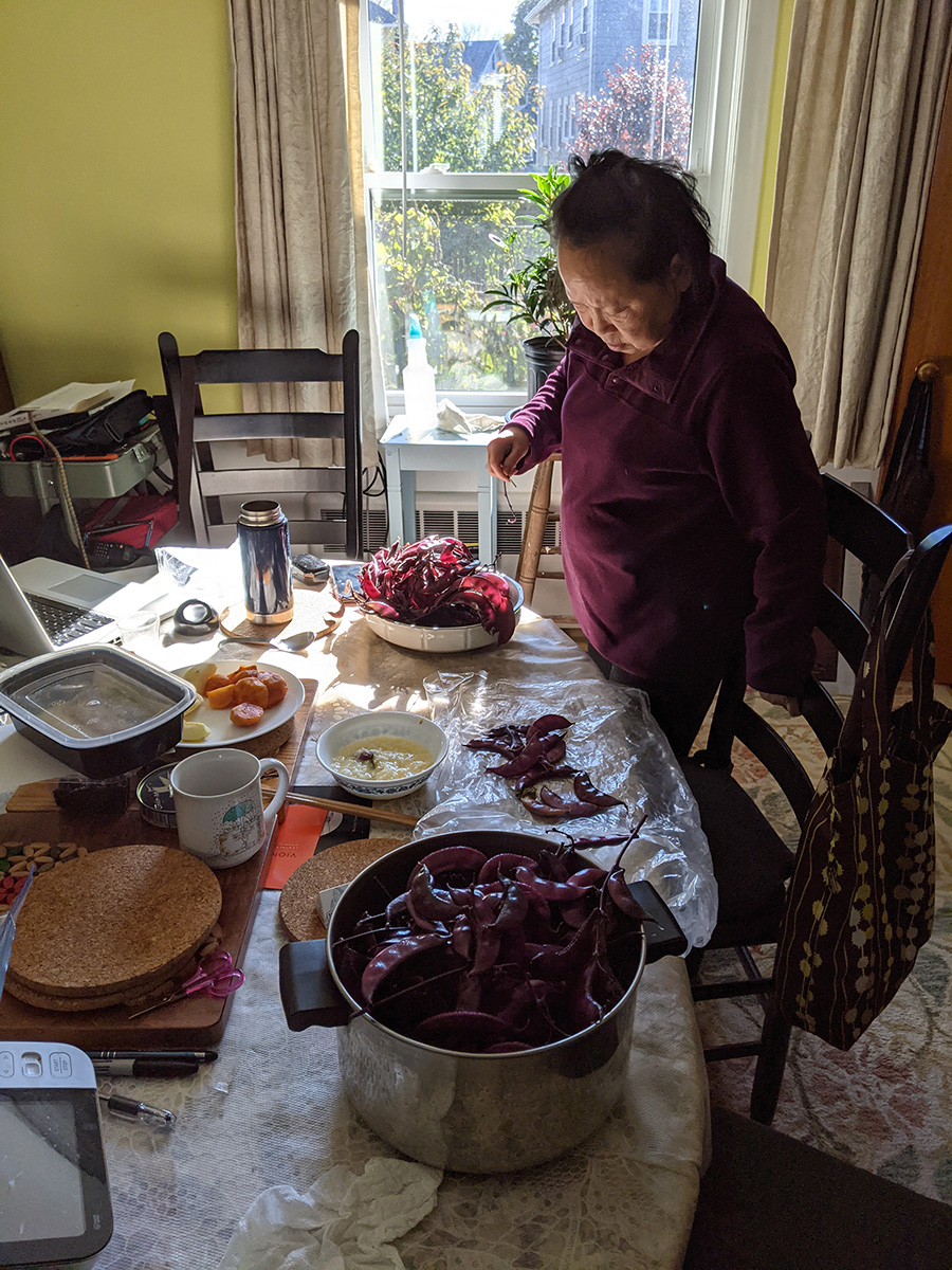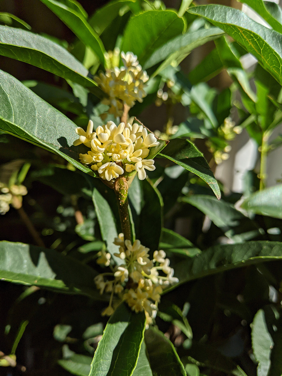 we went inside for lunch. my father had moved the fudingzhu osmanthus back into the living room again. there was a flourish of new flowers, and we ate while smelling its fragrance. my father cracked open some hyacinth beans but not a single one had ripe seeds, they were all pale. my mother thinks most of them aren't edible, but my father said they'd work well in a stew.