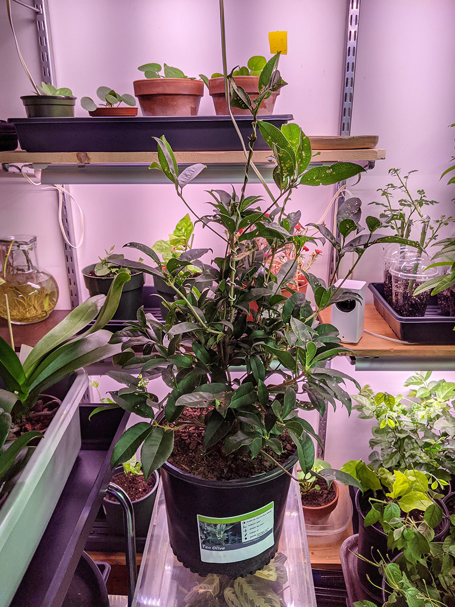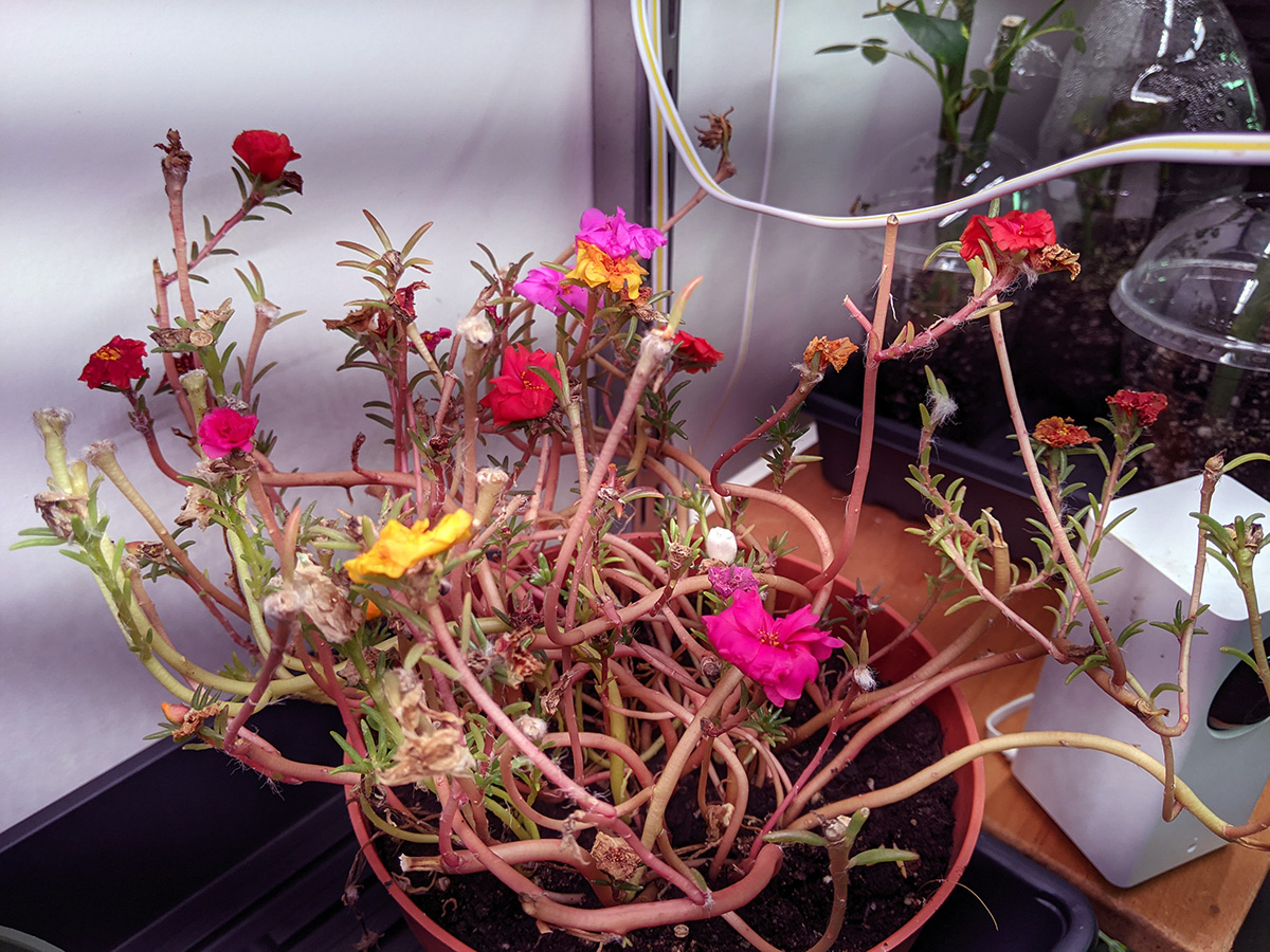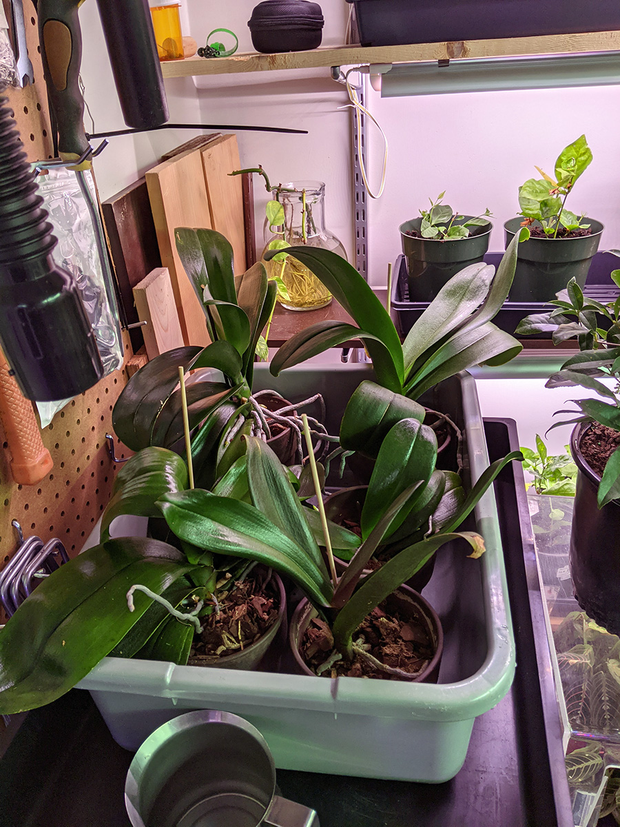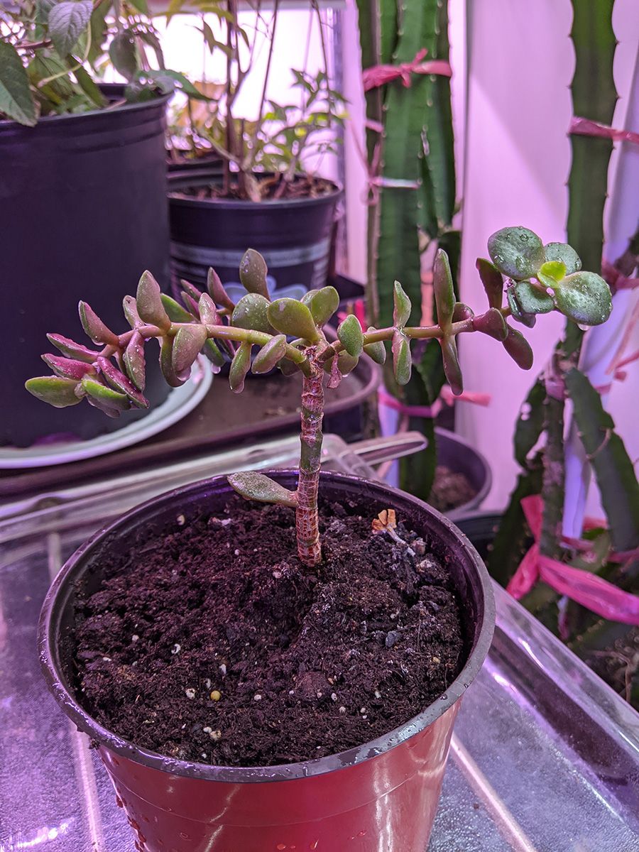 in the grow room i noticed our resident jade plant seemed to be droopy. when i checked more closely, it seemed to be infested with thick fat mealybugs. i brought it into the sink and sprayed it down with neem oil.