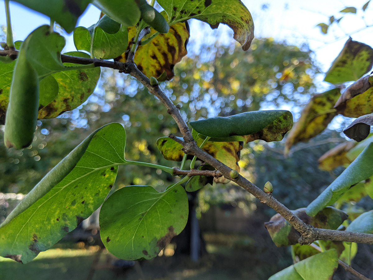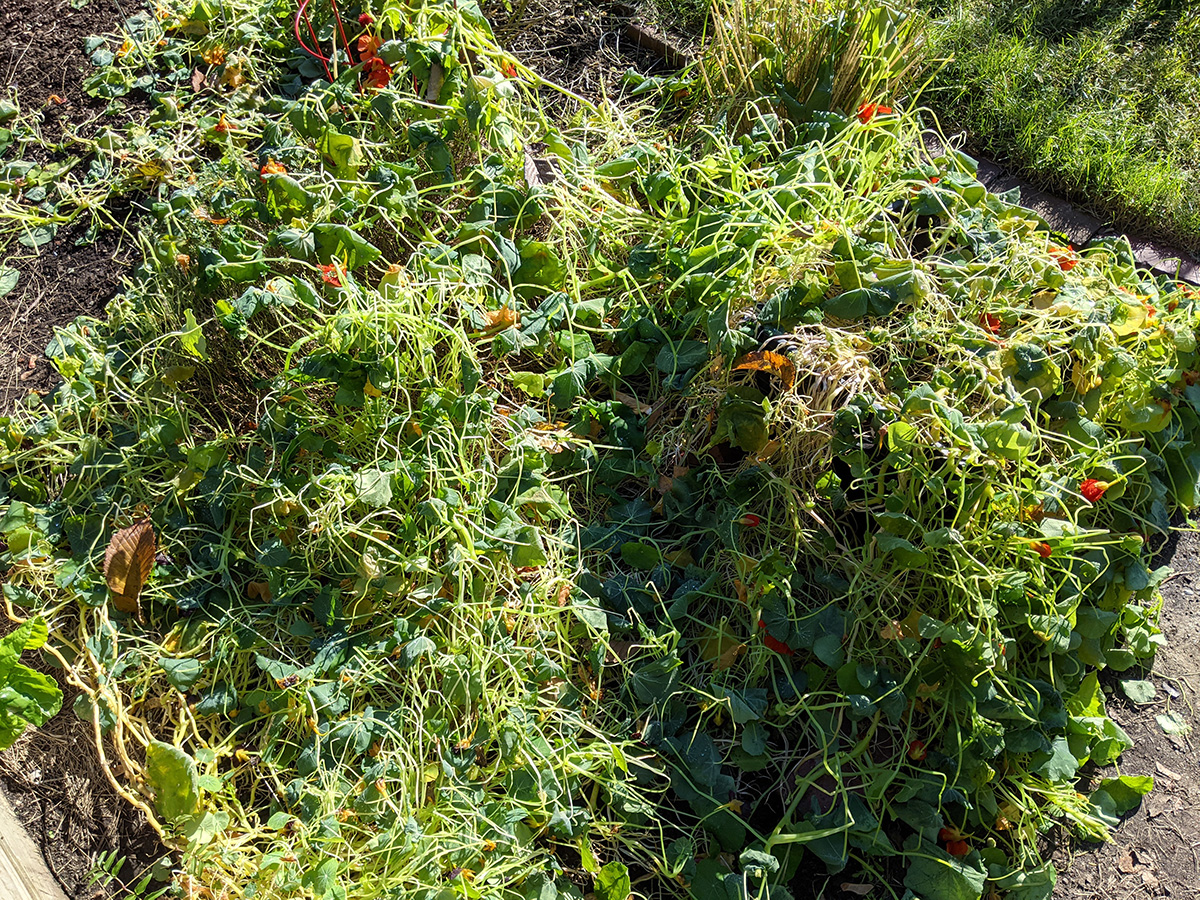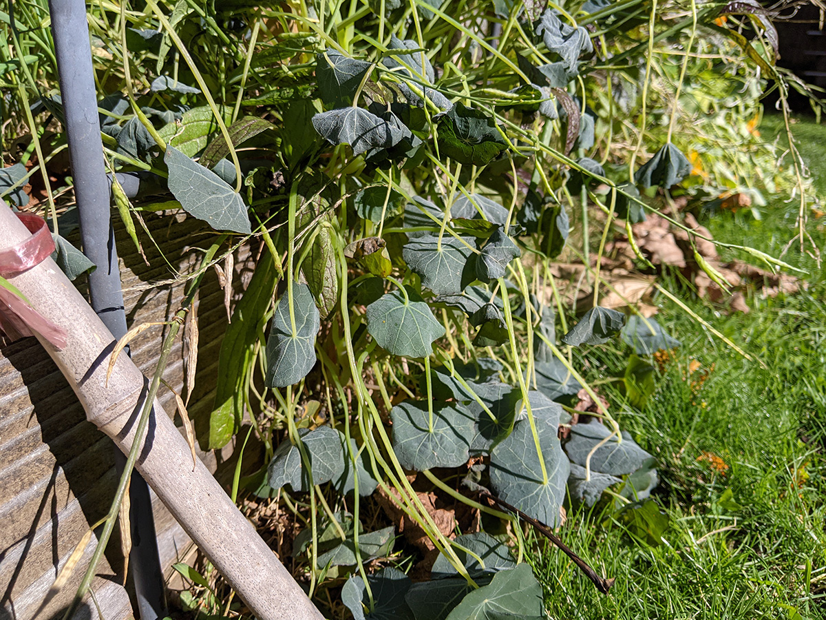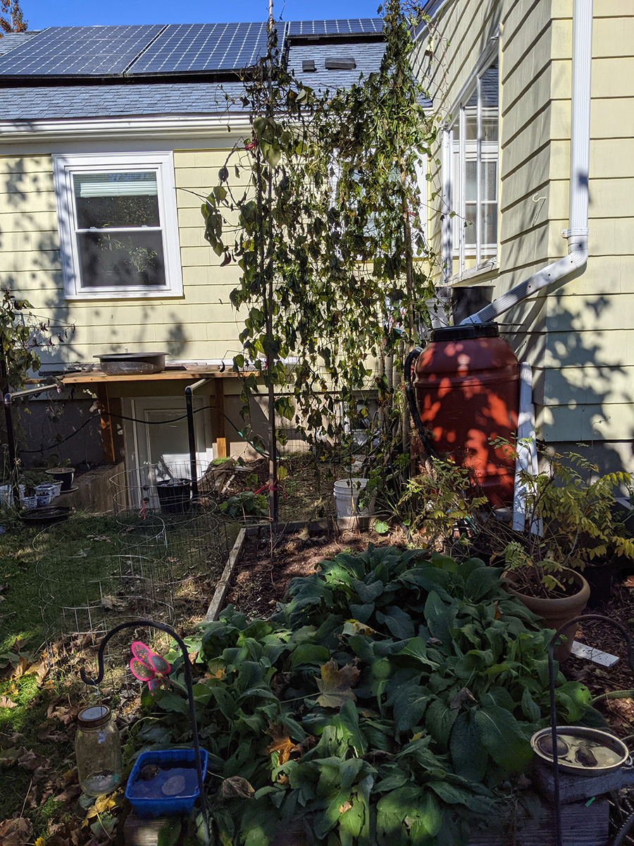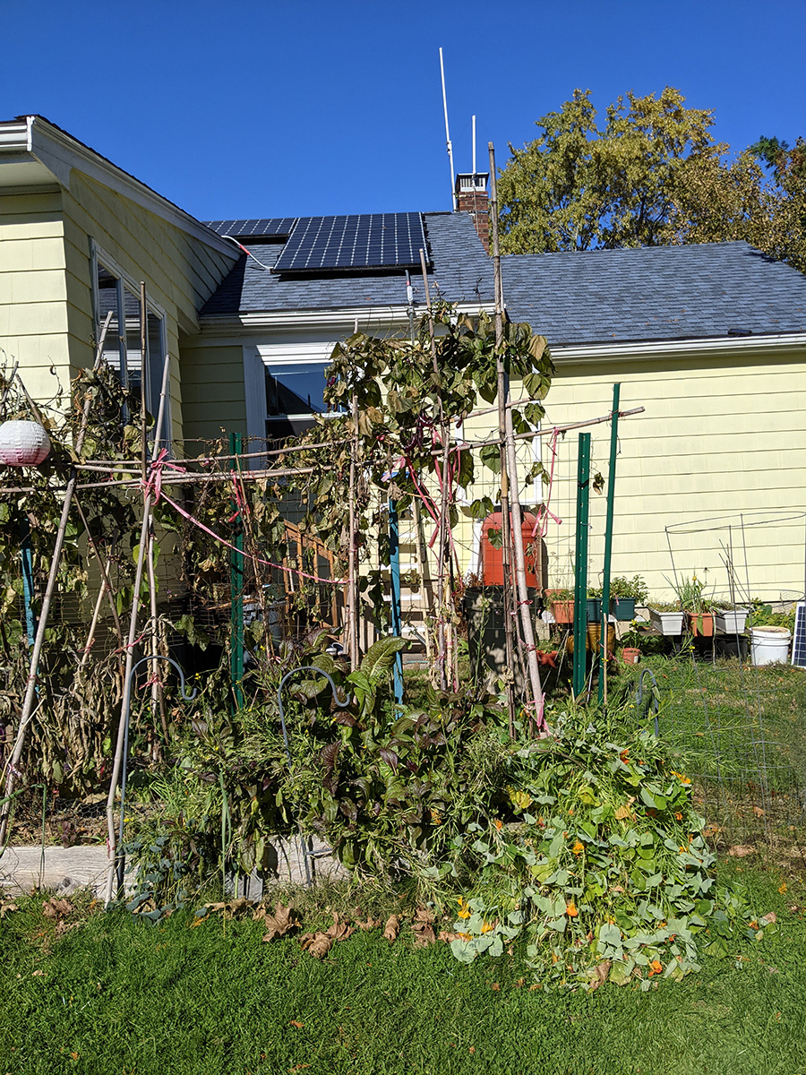from the community garden i rode directly to my parents' place. if we had frost in cambridge, most definitely belmont would've experienced the same. all the vine plants looked like they'd melted: the hyacinth beans, bitter melons, morning glories, moon flowers. nasturtiums typically can handle cooler weather but they can't handle the frost, and they were all wilted as well. not sure when we had frost last season. october 28rd i was still desperately trying to rescue some garden plants, then october 30th we had snow, so that was probably our frost date (snow sort of supersedes frost).
