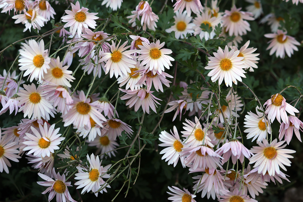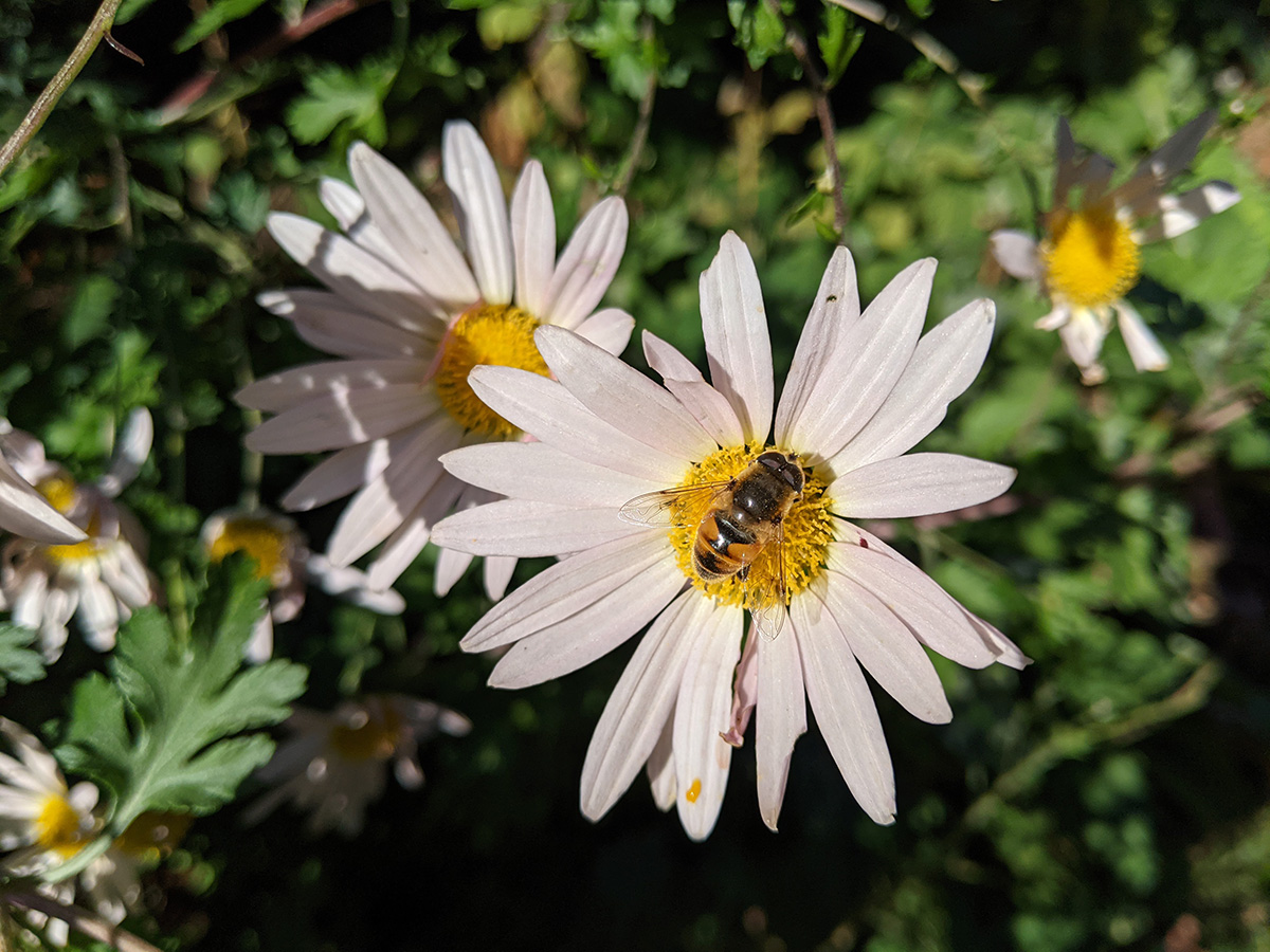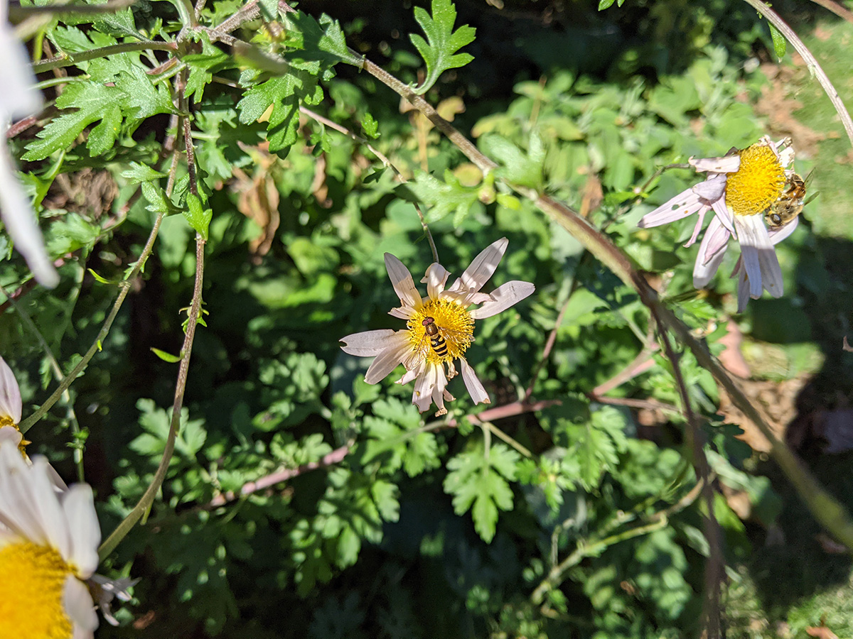 the hardy chrysanthemums were still in good shape, apparently it takes more than a touch of frost to kill them. they were buzzing with insects, but not one of them was a honeybee. they were mostly hover flies (occasionally a wasp), which i haven't seen too much lately, i usually see them in the spring when more flowers are in bloom.