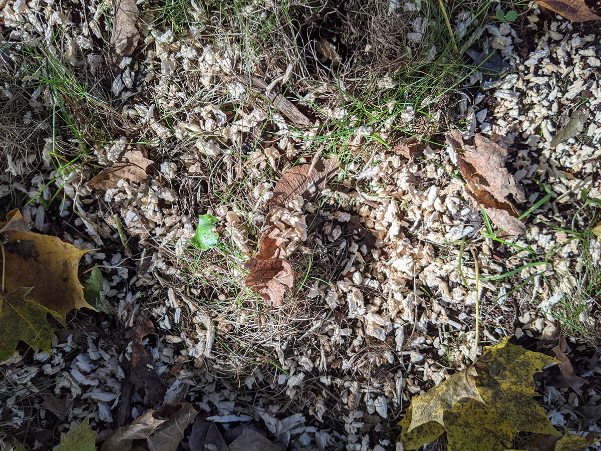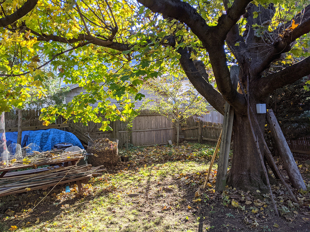 my father said there was a large hidden buttercup squash behind the raspberries and i checked it out. later he came out to have the honor of harvesting our last squash while i mowed the leaves around the backyard maple tree and tossed the pulverized clippings into the compost bin. i noticed emerging flower buds on the lilacs, next season's blooms.