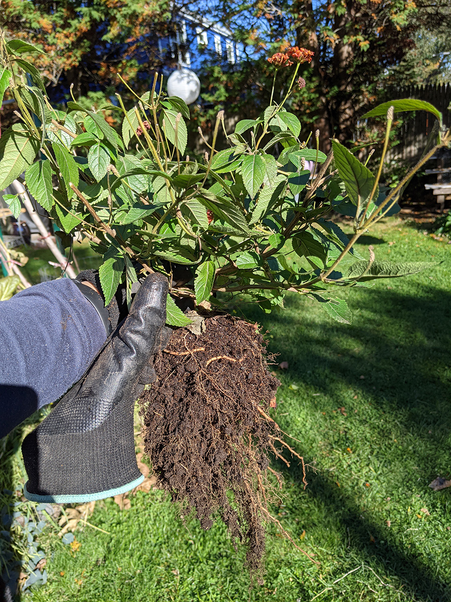 after lunch i was back outside. i dug out the lantana, one of the few plants to have survived the frost, though it looked a bit tender. i transplanted it into a pot so it can live through the winter in our grow room.