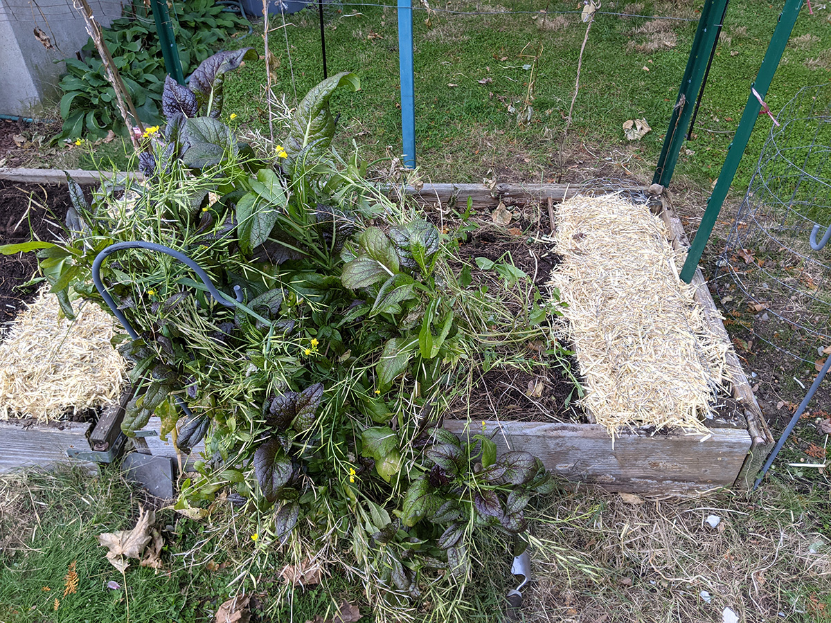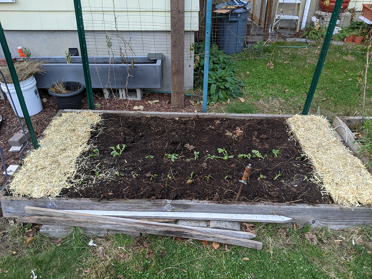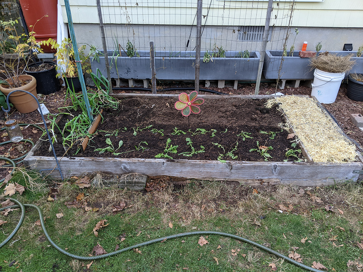 i also replanted some more daikon radish seedlings i pulled from RB1, along with a row of mustard seedlings. i also pulled out a bunch of baby garlics, which i replanted in the southern bed next to the rolling compost bin.