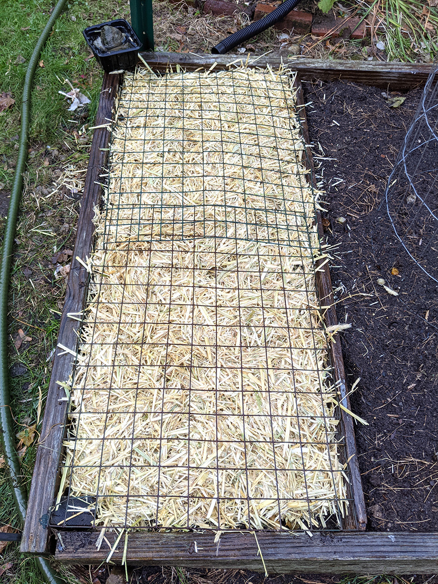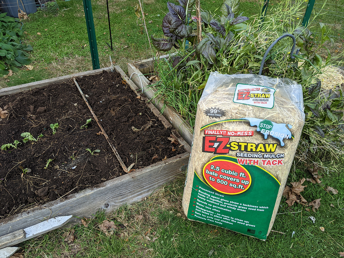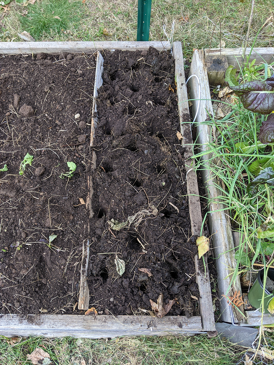 i also replanted some more daikon radish seedlings i pulled from RB1, along with a row of mustard seedlings. i also pulled out a bunch of baby garlics, which i replanted in the southern bed next to the rolling compost bin.