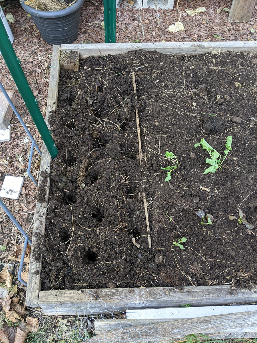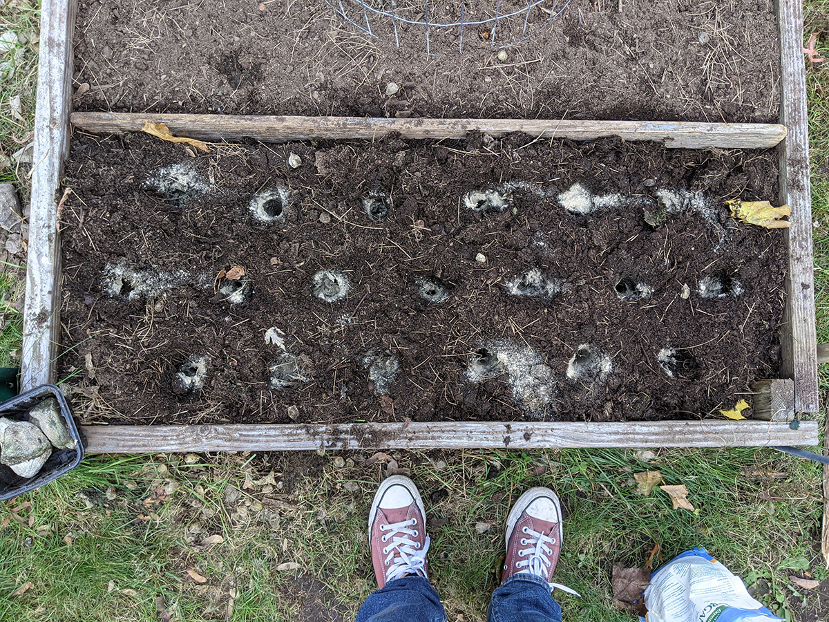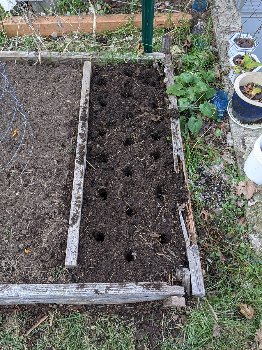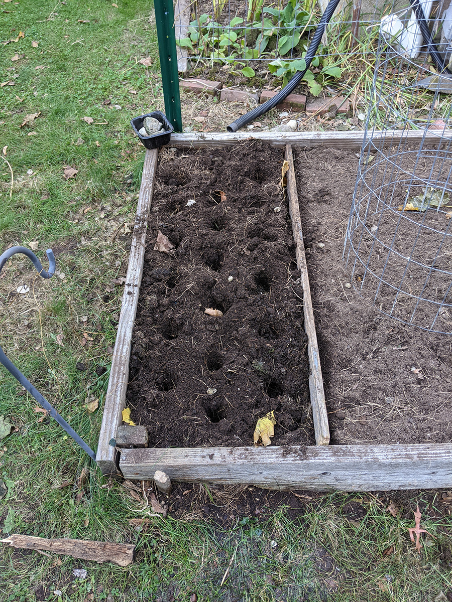 finally it came time to plant the garlics. using a metal rod, i made holes in the garlic beds: RB0 13, RB1 18L+17L, RB2 17, RB4 19L+19R. that's a grand total of 103, nearly exactly the same amount of garlics i planted last season using a single raised bed (RB2). i scooped some bone meal into each hole. last year i also sprinkled some espoma garden food (10-10-10) into the raised bed while my father dumped some soy bean mush, but this year we just had the chicken manure. a key for growing big garlics is to also fertilize come spring with something high in nitrogen, whether that's blood meal, more chicken manure, or synthetic nitrogen.