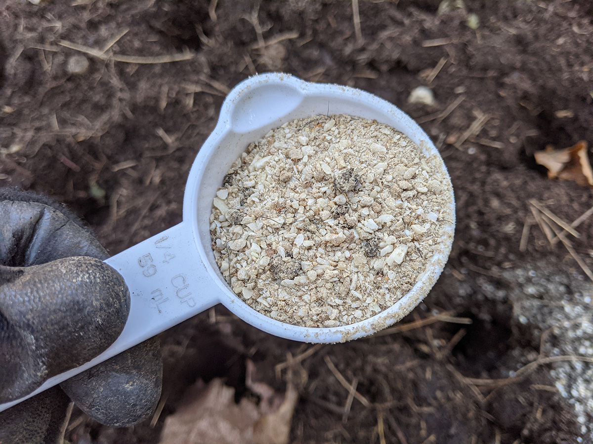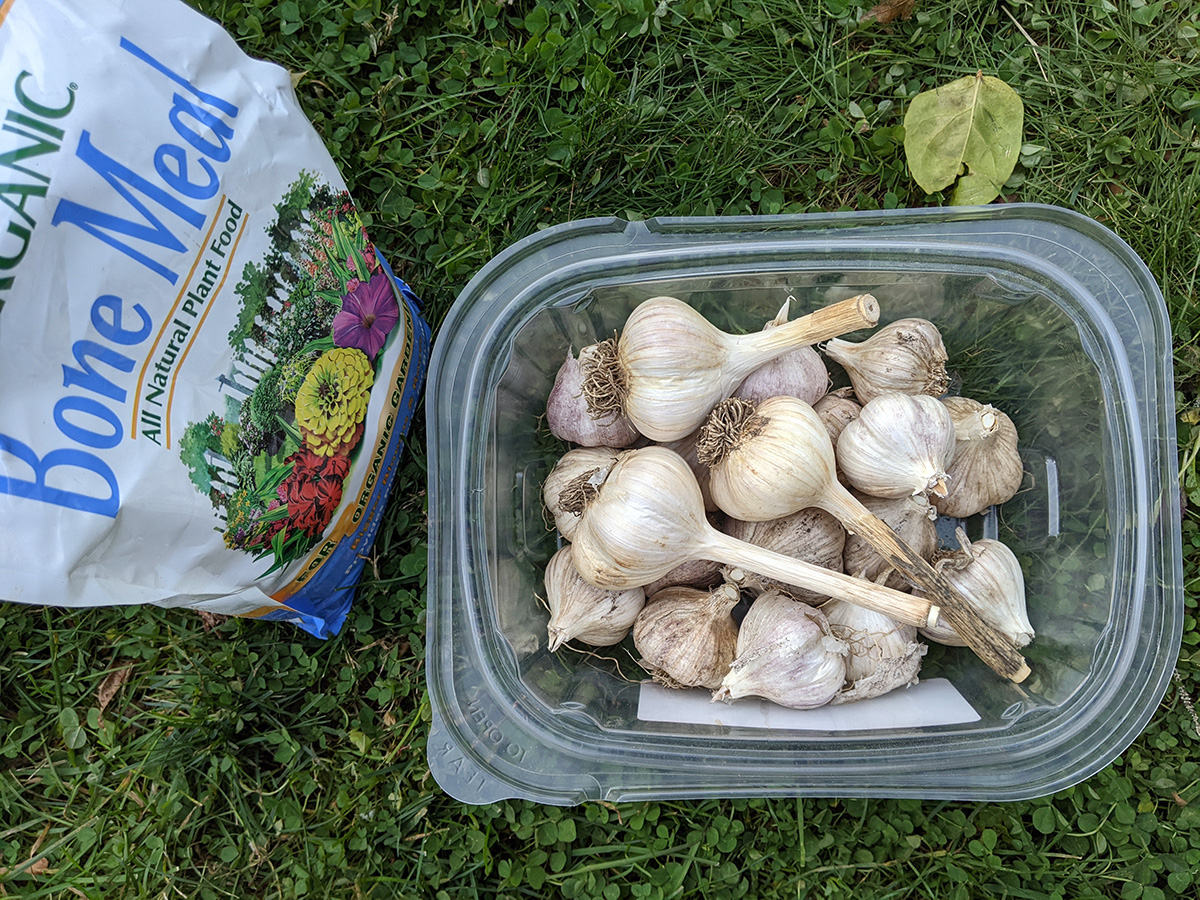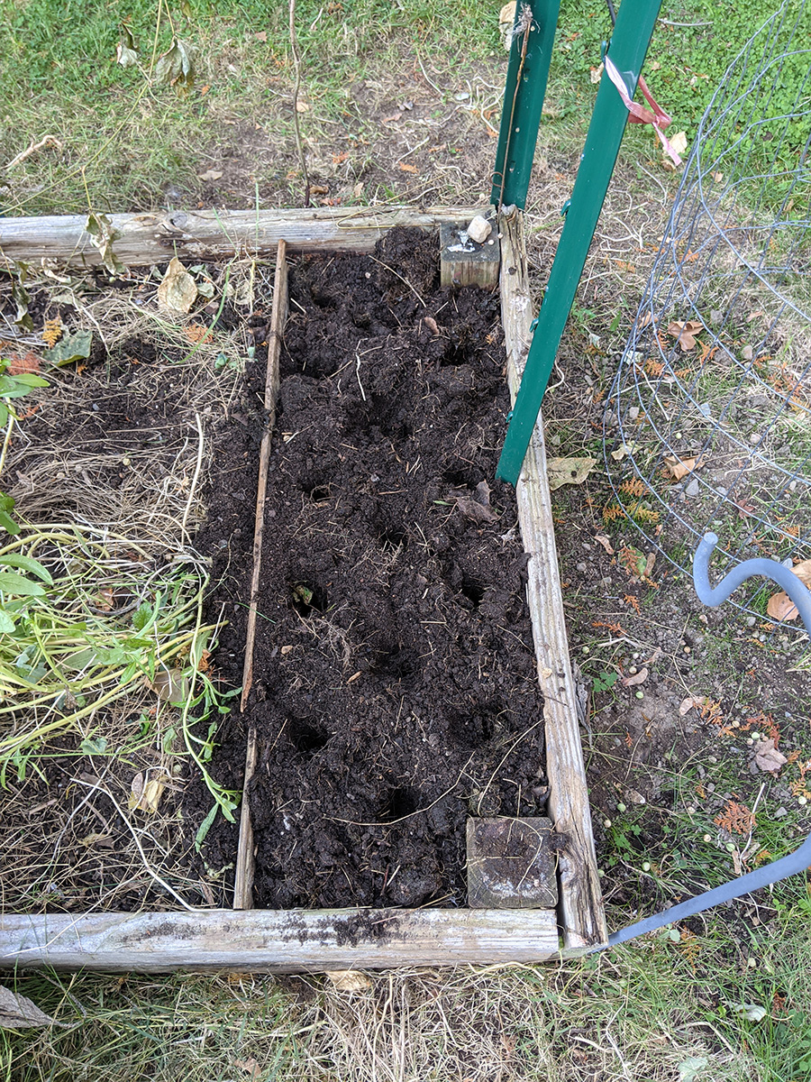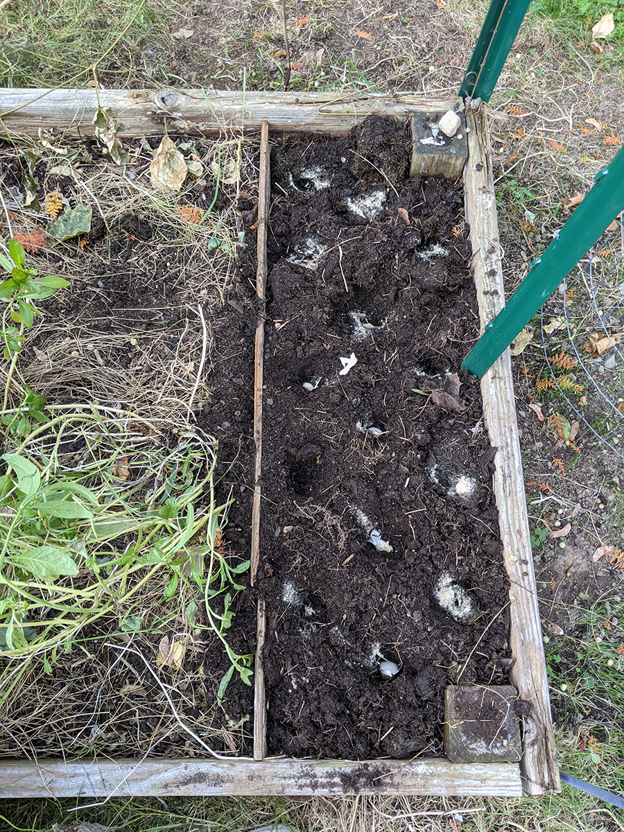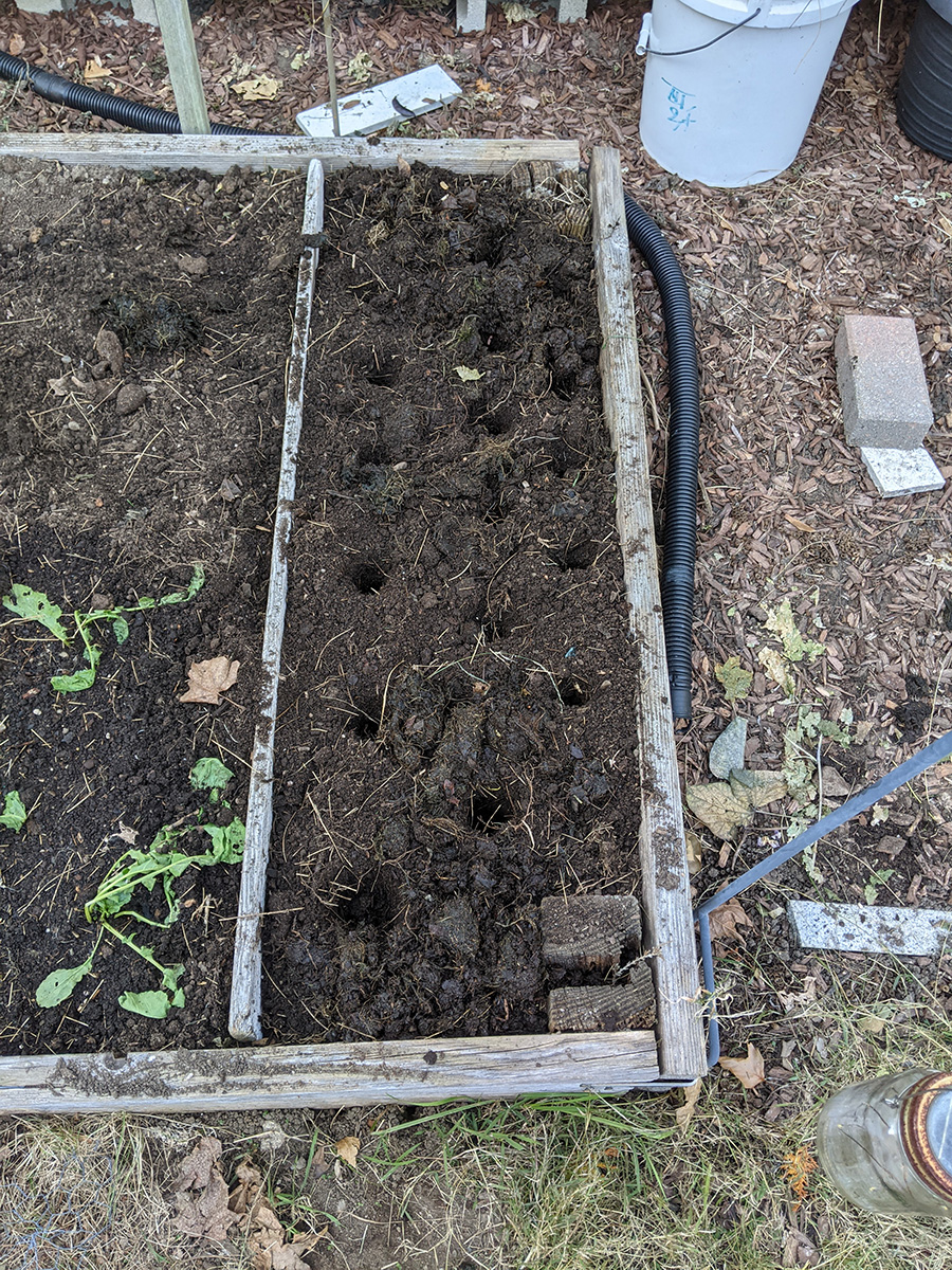finally it came time to plant the garlics. using a metal rod, i made holes in the garlic beds: RB0 13, RB1 18L+17L, RB2 17, RB4 19L+19R. that's a grand total of 103, nearly exactly the same amount of garlics i planted last season using a single raised bed (RB2). i scooped some bone meal into each hole. last year i also sprinkled some espoma garden food (10-10-10) into the raised bed while my father dumped some soy bean mush, but this year we just had the chicken manure. a key for growing big garlics is to also fertilize come spring with something high in nitrogen, whether that's blood meal, more chicken manure, or synthetic nitrogen.