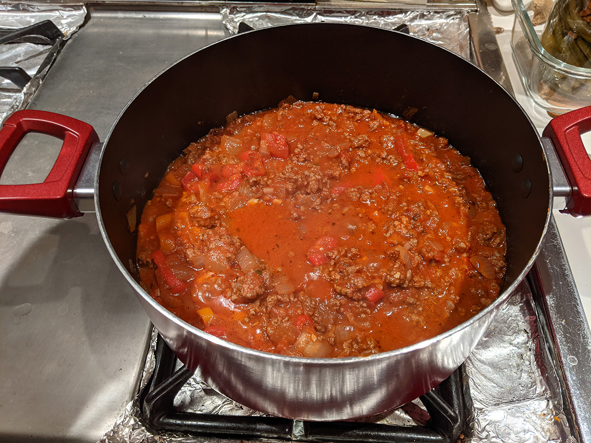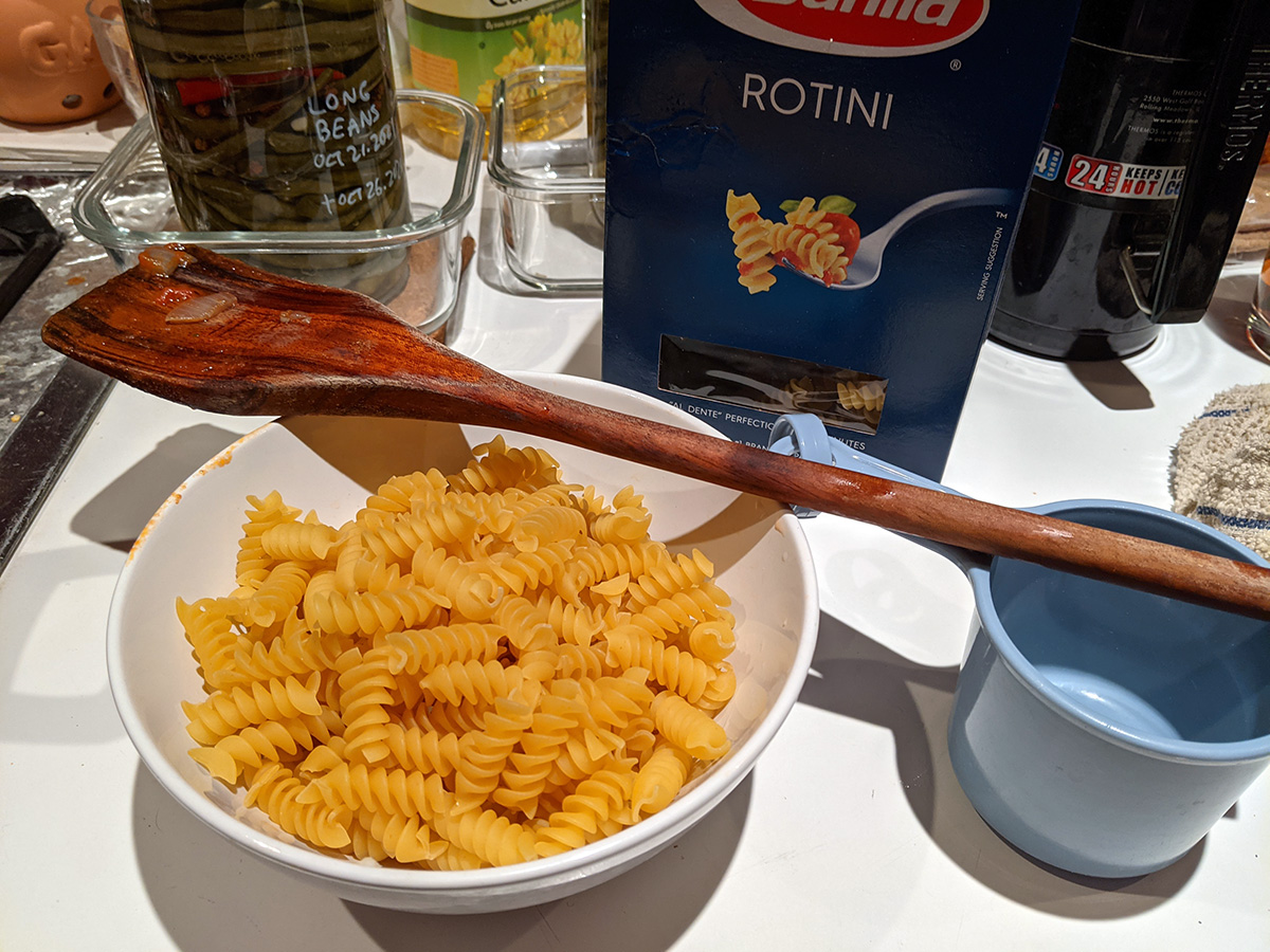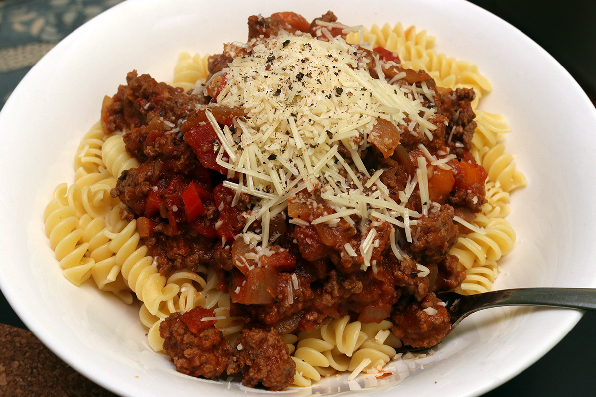 i didn't start preparing dinner until after 8pm. meat sauce pasta is an easy recipe, can be made in about 30 minutes. cooked some chopped onion and garlic first, brown the ground beef, then pour in a garlic of tomato sauce (24oz). i also added some italian spices, some hot pepper flakes, and some chopped sweet peppers. no salt was added, the sauce itself contains a bit of salt, plus i also sprinkle some shredded parmesan cheese afterwards. i cooked a whole bowl of rotini pasta, i was pretty hungry, having not eaten the entire day.