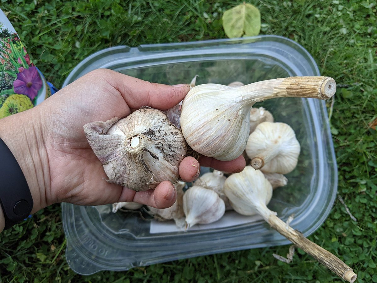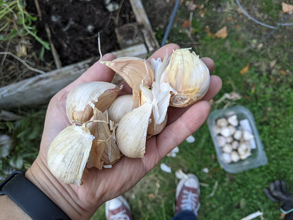 i planted red korean garlics in the remaining beds. i'd picked out the remaining large garlics for planting, but i actually ran out, because some of the cloves had dried tips, and i didn't think those were viable. fortunately i had more small to medium garlics back inside, and i picked out a few medium ones to harvest the cloves for planting.